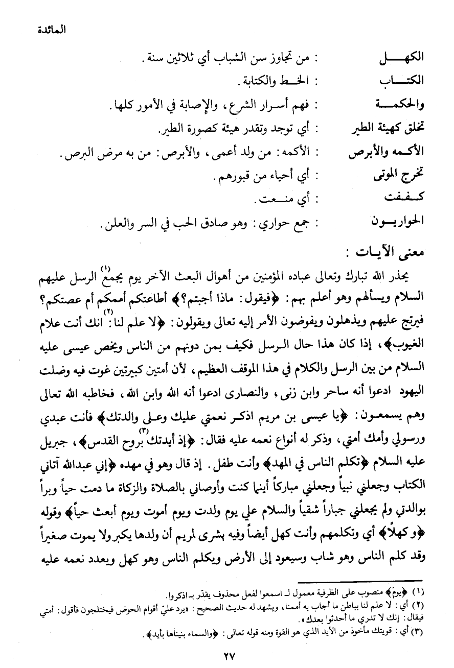 يحذر الله تبارك وتعالى عباده المؤمنين من أهوال البعث الآخر يوم يجمع1 الرسل عليهم السلام ويسألهم وهو أعلم بهم: {فيقول: ماذا أجبتم؟} أطاعتكم أممكم أم عصتكم؟ فيرتج عليهم ويذهلون ويفوضون الأمر إليه تعالى ويقولون: {لا علم لنا2: انك أنت علام الغيوب} ، إذا كان هذا حال الرسل فكيف بمن دونهم من الناس ويخص عيسى عليه السلام من بين الرسل بالكلام في هذا الموقف العظيم، لأن أمتين كبيرتين غوت فيه وضلت اليهود ادعوا أنه ساحر وابن زنى، والنصارى ادعوا أنه الله وابن الله، فخاطبه الله تعالى وهم يسمعون: {يا عيسى بن مريم اذكر نعمتي عليك وعلى والدتك} فأنت عبدي ورسولي وأمك أمتي، وذكر له أنواع نعمه عليه فقال: {إذ أيدتك3 بروح القدس} ، جبريل عليه السلام {تكلم الناس في المهد} وأنت طفل. إذ قال وهو في مهده {إني عبد الله آتاني الكتاب وجعلني نبياً، وجعلني مباركاً أينما كنت وأوصاني بالصلاة والزكاة ما دمت حياً وبراً بوالدتي ولم يجعلني جباراً شقياً والسلام علي يوم ولدت ويوم أموت ويوم أبعث حياً} وقوله {وكهلاً} أي وتكلمهم وأنت كهل أيضاً وفيه بشرى لمريم أن ولدها يكبر ولا يموت صغيراً وقد كلم الناس وهو شاب وسيعود إلى الأرض ويكلم الناس وهو كهل ويعدد نعمه عليه