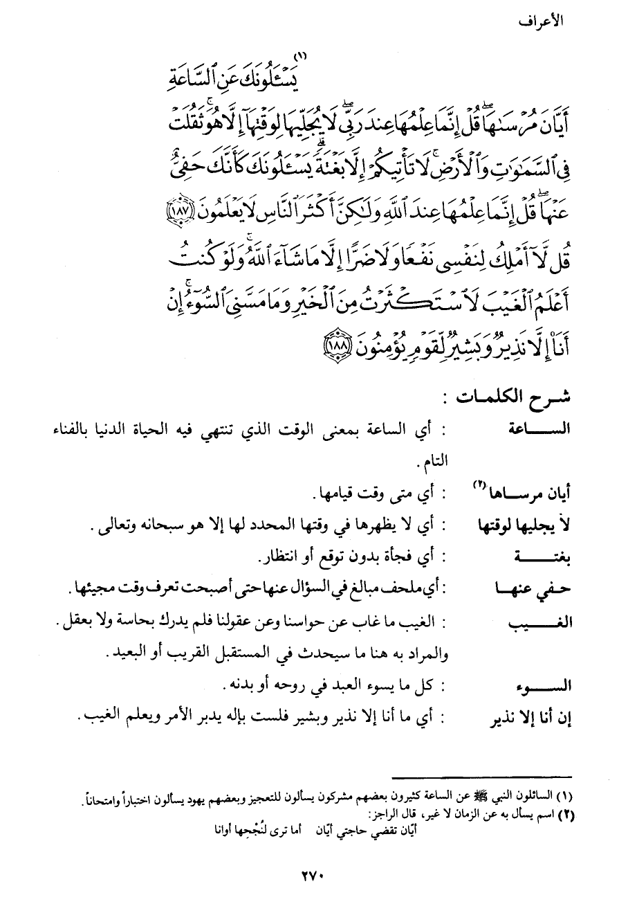 1 يَسْأَلُونَكَ عَنِ السَّاعَةِ أَيَّانَ مُرْسَاهَا قُلْ إِنَّمَا عِلْمُهَا عِندَ رَبِّي لاَ يُجَلِّيهَا لِوَقْتِهَا إِلاَّ هُوَ ثَقُلَتْ فِي السَّمَاوَاتِ وَالأَرْضِ لاَ تَأْتِيكُمْ إِلاَّ بَغْتَةً يَسْأَلُونَكَ كَأَنَّكَ حَفِيٌّ عَنْهَا قُلْ إِنَّمَا عِلْمُهَا عِندَ اللهِ وَلَكِنَّ أَكْثَرَ النَّاسِ لاَ يَعْلَمُونَ (187) قُل لاَّ أَمْلِكُ لِنَفْسِي نَفْعًا وَلاَ ضَرًّا إِلاَّ مَا شَاء اللهُ وَلَوْ كُنتُ أَعْلَمُ الْغَيْبَ لاَسْتَكْثَرْتُ مِنَ الْخَيْرِ وَمَا مَسَّنِيَ السُّوءُ إِنْ أَنَاْ إِلاَّ نَذِيرٌ وَبَشِيرٌ لِّقَوْمٍ يُؤْمِنُونَ (188)