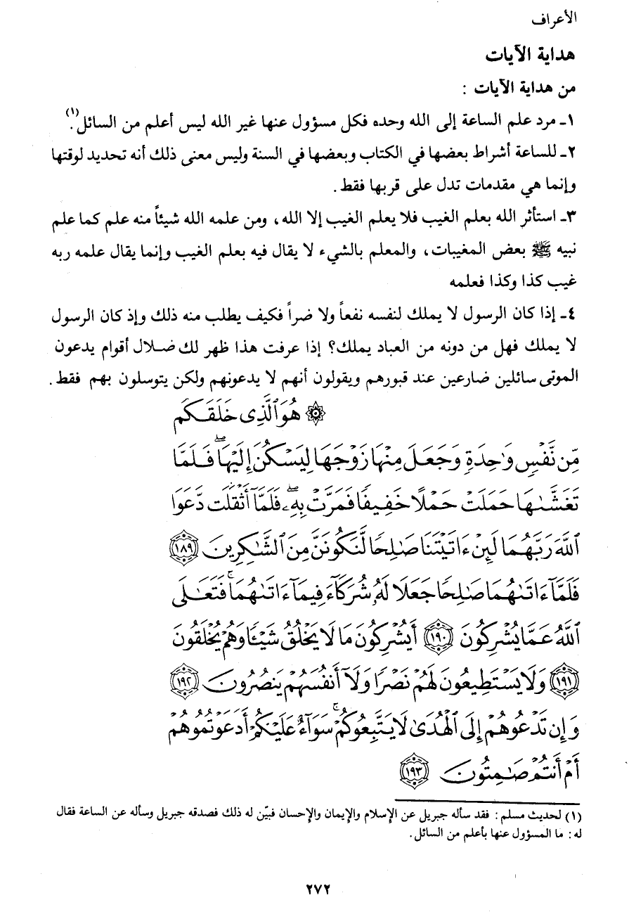 هُوَ الَّذِي خَلَقَكُم مِّن نَّفْسٍ وَاحِدَةٍ وَجَعَلَ مِنْهَا زَوْجَهَا لِيَسْكُنَ إِلَيْهَا فَلَمَّا تَغَشَّاهَا حَمَلَتْ حَمْلاً خَفِيفًا فَمَرَّتْ بِهِ فَلَمَّا أَثْقَلَت دَّعَوَا اللهَ رَبَّهُمَا لَئِنْ آتَيْتَنَا صَالِحاً لَّنَكُونَنَّ مِنَ الشَّاكِرِينَ (189) فَلَمَّا آتَاهُمَا صَالِحاً جَعَلاَ لَهُ شُرَكَاء فِيمَا آتَاهُمَا فَتَعَالَى الله عَمَّا يُشْرِكُونَ (190) أَيُشْرِكُونَ مَا لاَ يَخْلُقُ شَيْئاً وَهُمْ يُخْلَقُونَ (191) وَلاَ يَسْتَطِيعُونَ لَهُمْ نَصْرًا وَلاَ أَنفُسَهُمْ يَنصُرُونَ (192) وَإِن تَدْعُوهُمْ إِلَى الْهُدَى لاَ يَتَّبِعُوكُمْ سَوَاء عَلَيْكُمْ أَدَعَوْتُمُوهُمْ أَمْ أَنتُمْ صَامِتُونَ (193)