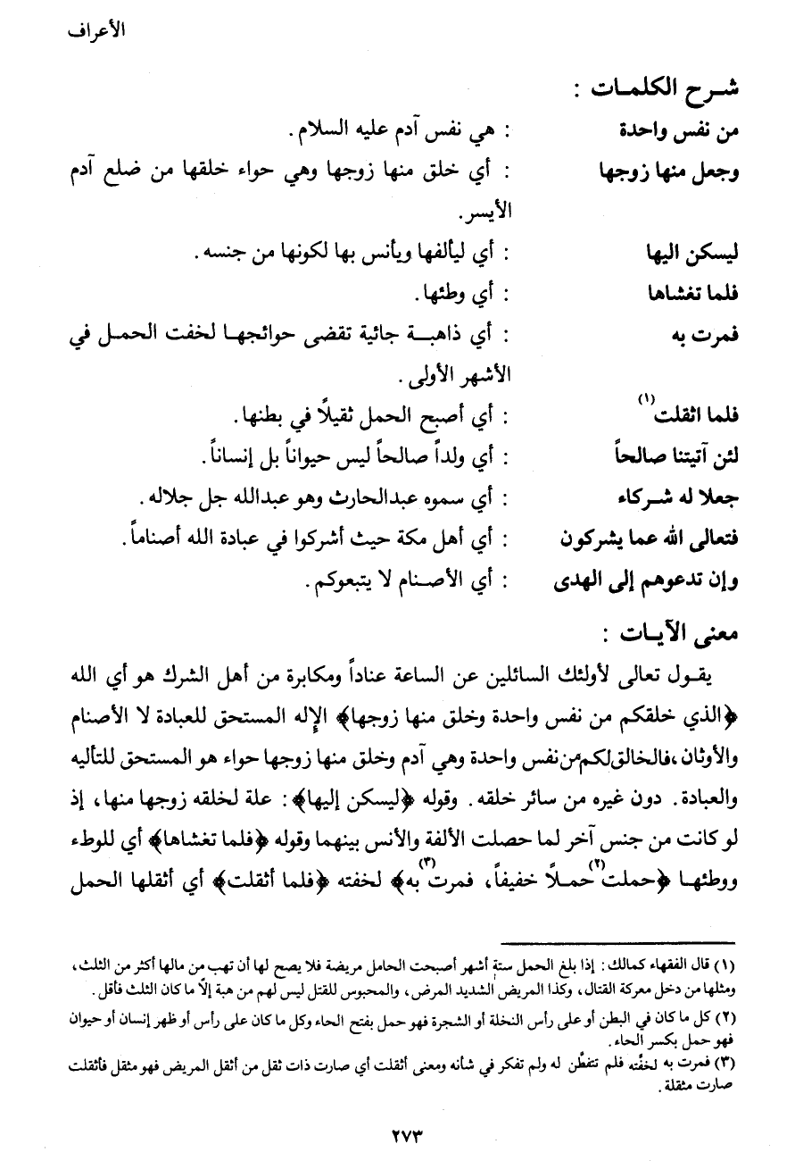 يقول تعالى لأولئك السائلين عن الساعة عناداً ومكابرة من أهل الشرك هو أي الله {الذي خلقكم من نفس واحدة وخلق منها زوجها} الإله المستحق للعبادة لا الأصنام والأوثان، فالخالق لكم من نفس واحدة وهي آدم وخلق منها زوجها حواء هو المستحق للتأليه والعبادة. دون غيره من سائر خلقه. وقوله {ليسكن إليها} : علة لخلقه زوجها منها، إذ لو كانت من جنس آخر لما حصلت الألفة والأنس بينهما وقوله {فلما تغشاها} أي للوطء ووطئها {حملت2 حملاً خفيفاً فمرت3 به} لخفته {فلما أثقلت} أي أثقلها الحمل