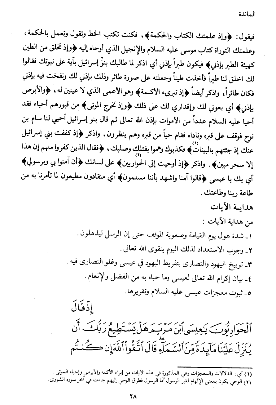 فيقول: {وإذ علمتك الكتاب والحكمة} ، فكنت تكتب الخط وتقول وتعمل بالحكمة، وعلمتك التوراة كتاب موسى عليه السلام والإنجيل الذي أوحاه إليه {وإذ تخلق من الطين كهيئة الطير بإذني} فيكون طيراً بإذني أي اذكر لما طالبك بنو إسرائيل بآية على نبوتك فقالوا لك اخلق لنا طيراً فأخذت طيناً وجعلته على صورة طائر وذلك بإذني لك ونفخت فيه بإذني فكان طائراً، واذكر أيضاً {إذ تبرىء الأكمة} وهو الأعمى الذي لا عينين له، {والأبرص بإذني} أي بعوني لك وإقداري لك على ذلك {وإذ تخرج الموتى} من قبورهم أحياء فقد أحيا عليه السلام عدداً من الأموات بإذن الله تعالى ثم قال بنو إسرائيل أحيي لنا سام بن نوح فوقف على قبره وناداه فقام حياً من قبره وهم ينظرون، واذكر {إذ كففت بني إسرائيل عنك إذ جئتهم بالبينات1} فكذبوك وهموا بقتلك وصلبك، {فقال الذين كفروا منهم إن هذا إلا سحر مبين} . واذكر {إذ أوحيت إلى الحواريين2} على لسانك {أن آمنوا بي وبرسولي} أي بك يا عيسى {قالوا آمنا واشهد بأننا مسلمون} أي منقادون مطيعون لما تأمرنا به من طاعة ربنا وطاعتك.