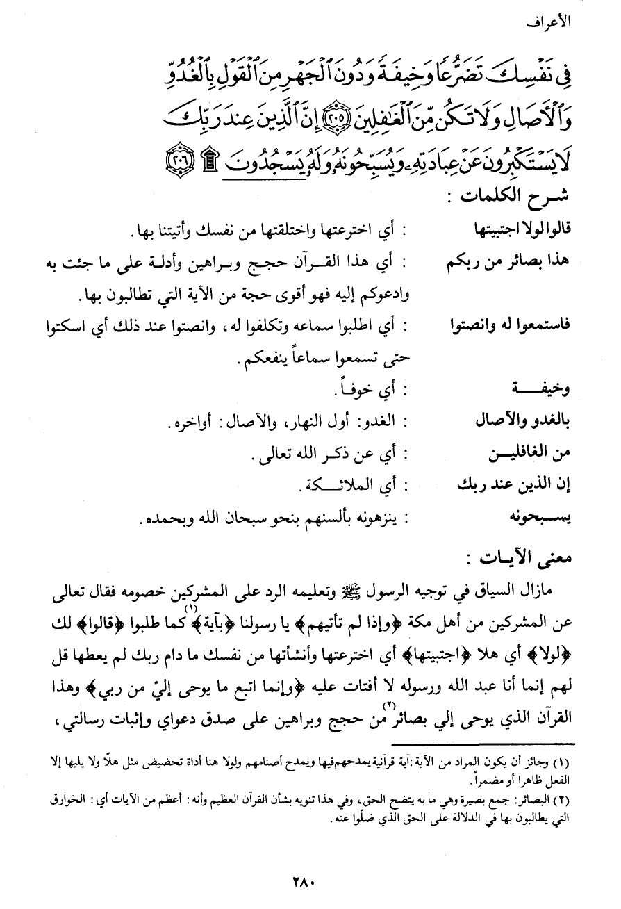 فِي نَفْسِكَ تَضَرُّعاً وَخِيفَةً وَدُونَ الْجَهْرِ مِنَ الْقَوْلِ بِالْغُدُوِّ وَالآصَالِ وَلاَ تَكُن مِّنَ الْغَافِلِينَ (205) إِنَّ الَّذِينَ عِندَ رَبِّكَ لاَ يَسْتَكْبِرُونَ عَنْ عِبَادَتِهِ وَيُسَبِّحُونَهُ وَلَهُ يَسْجُدُونَ (206)