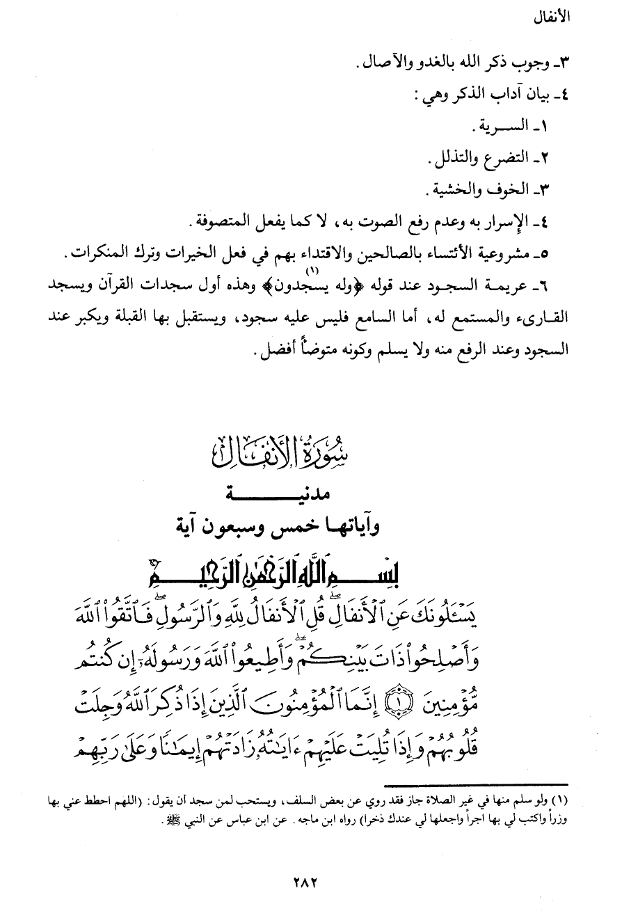 يَسْأَلُونَكَ عَنِ الأَنفَالِ قُلِ الأَنفَالُ لِلّهِ وَالرَّسُولِ فَاتَّقُواْ اللهَ وَأَصْلِحُواْ ذَاتَ بِيْنِكُمْ وَأَطِيعُواْ اللهَ وَرَسُولَهُ إِن كُنتُم مُّؤْمِنِينَ (1) إِنَّمَا الْمُؤْمِنُونَ الَّذِينَ إِذَا ذُكِرَ اللهُ وَجِلَتْ قُلُوبُهُمْ وَإِذَا تُلِيَتْ عَلَيْهِمْ آيَاتُهُ زَادَتْهُمْ إِيمَانًا وَعَلَى رَبِّهِمْ