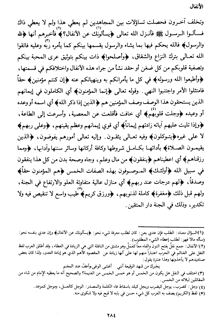 2 الأنفال: جمع نفلٌ بفتح النون والفاء معاً كعَمَلٌ وهو مشتق من النافلة التي هي الزيادة في العطاء، وقد أطلق العرب لفظ النفل على الغنائم في الحرب اعتباراً منهم لها على أنها زيادة عن المقصود الأهم الذي هو إبادة العدو، ولذا كان بعض صناديدهم لا يأخذونها وهذا عنترة يقول: