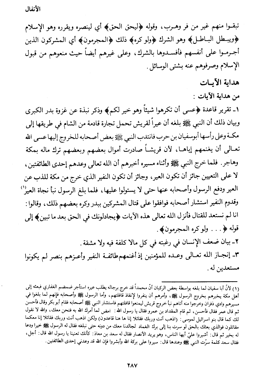1- تقرير قاعدة {عسى أن تكرهوا شيئاً وهو خير لكم} وذكر نبذة عن غزوة بدر الكبرى وبيان ذلك أن النبي صَلَّى اللهُ عَلَيْهِ وَسَلَّمَ بلغه أن عيراً لقريش تحمل تجارة قادمة من الشام في طريقها إلى مكة وعلى رأسها أبو سفيان بن حرب فانتدب النبي صَلَّى اللهُ عَلَيْهِ وَسَلَّمَ بعض أصحابه للخروج إليها عسى الله تعالى أن يغنمهم إياها، لأن قريشاً صادرت أموال بعضهم وبعضهم ترك ماله بمكة وهاجر. فلما خرج النبي صَلَّى اللهُ عَلَيْهِ وَسَلَّمَ وأثناء مسيره أخبرهم أن الله تعالى وعدهم إحدى الطائفتين، لا على التعيين جائز أن تكون العير، وجائز أن تكون النفير الذي خرج من مكة للذب عن العير ودفع الرسول وأصحابه عنها حتى لا يستولوا عليها، فلما بلغ الرسول نبأ نجاة العير1 وقدوم النفير استشار أصحابه فوافقوا على قتال المشركين ببدر وكره بعضهم ذلك، وقالوا: إنا لم نستعد للقتال فأنزل الله تعالى هذه الآيات {يجادلونك في الحق بعد ما تبين} إلى قوله { ... ولو كره المجرمون} .