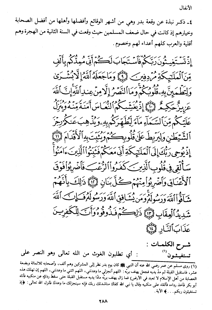 إِذْ تَسْتَغِيثُونَ رَبَّكُمْ فَاسْتَجَابَ لَكُمْ أَنِّي مُمِدُّكُم بِأَلْفٍ مِّنَ الْمَلآئِكَةِ مُرْدِفِينَ (9) وَمَا جَعَلَهُ اللهُ إِلاَّ بُشْرَى وَلِتَطْمَئِنَّ بِهِ قُلُوبُكُمْ وَمَا النَّصْرُ إِلاَّ مِنْ عِندِ اللهِ إِنَّ اللهَ عَزِيزٌ حَكِيمٌ (10) إِذْ يُغَشِّيكُمُ النُّعَاسَ أَمَنَةً مِّنْهُ وَيُنَزِّلُ عَلَيْكُم مِّن السَّمَاء مَاء لِّيُطَهِّرَكُم بِهِ وَيُذْهِبَ عَنكُمْ رِجْزَ الشَّيْطَانِ وَلِيَرْبِطَ عَلَى قُلُوبِكُمْ وَيُثَبِّتَ بِهِ الأَقْدَامَ (11) إِذْ يُوحِي رَبُّكَ إِلَى الْمَلآئِكَةِ أَنِّي مَعَكُمْ فَثَبِّتُواْ الَّذِينَ آمَنُواْ سَأُلْقِي فِي قُلُوبِ الَّذِينَ كَفَرُواْ الرَّعْبَ فَاضْرِبُواْ فَوْقَ الأَعْنَاقِ وَاضْرِبُواْ مِنْهُمْ كُلَّ بَنَانٍ (12) ذَلِكَ بِأَنَّهُمْ شَآقُّواْ اللهَ وَرَسُولَهُ وَمَن يُشَاقِقِ اللهَ وَرَسُولَهُ فَإِنَّ اللهَ شَدِيدُ الْعِقَابِ (13) ذَلِكُمْ فَذُوقُوهُ وَأَنَّ لِلْكَافِرِينَ عَذَابَ النَّارِ (14)
