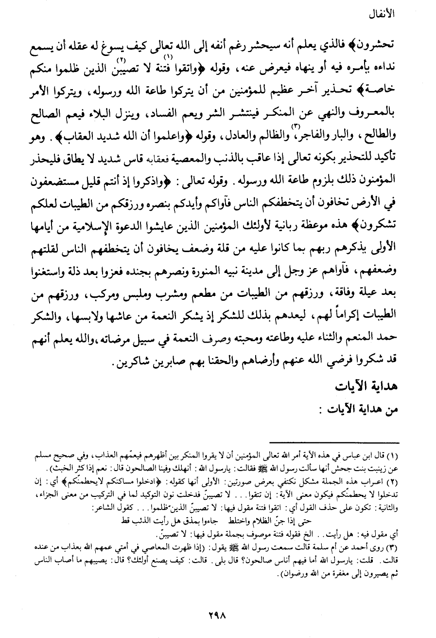 1 قال ابن عباس في هذه الآية أمر الله تعالى المؤمنين أن لا يقروا المنكر بين أظهرهم فيعمّهم العذاب، وفي صحيح مسلم عن زينب بنت جحش أنها سألت رسول الله صَلَّى اللهُ عَلَيْهِ وَسَلَّمَ فقالت: يا رسول الله: أنهلك وفينا الصالحون قال: نعم إذا كثر الخبث".
