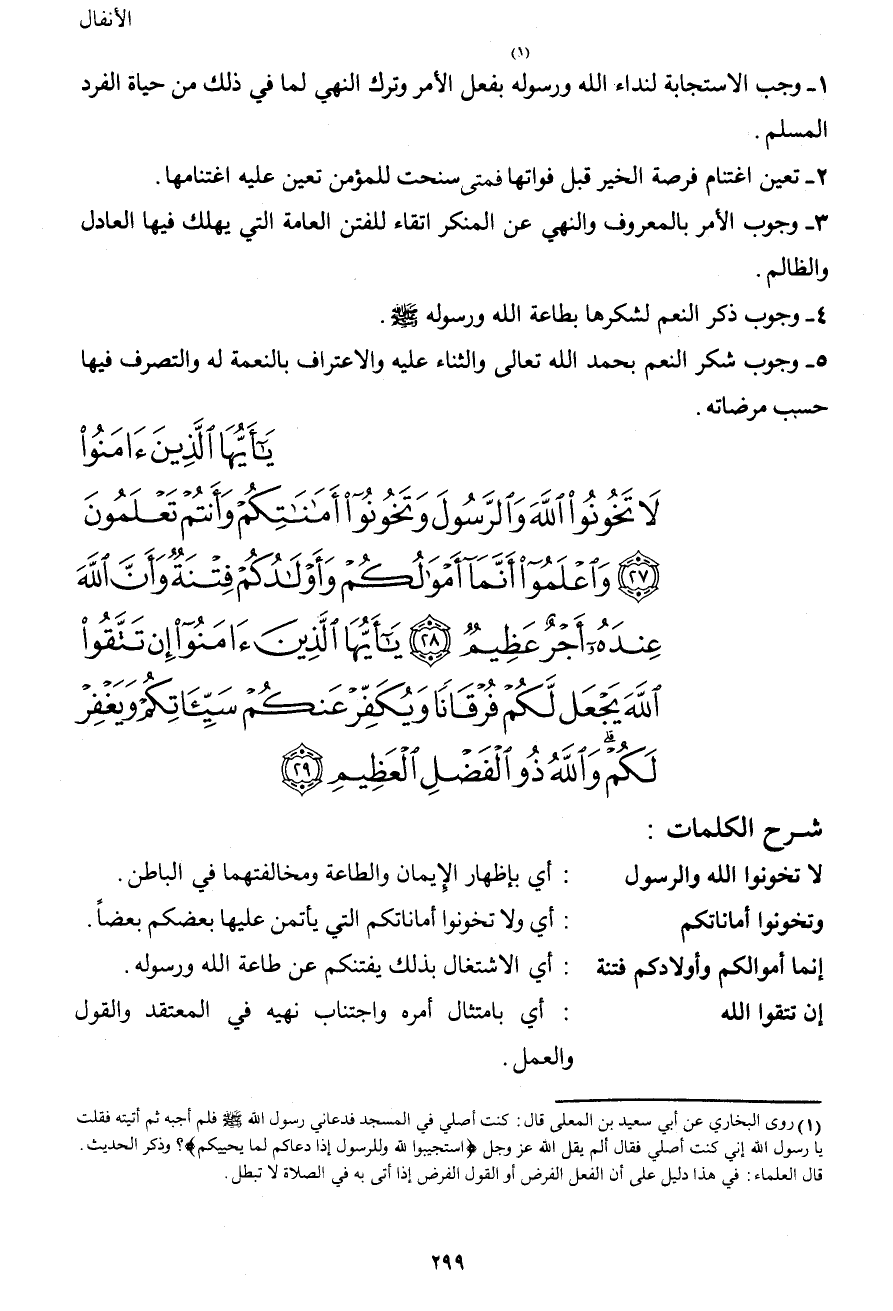 يَا أَيُّهَا الَّذِينَ آمَنُواْ لاَ تَخُونُواْ اللهَ وَالرَّسُولَ وَتَخُونُواْ أَمَانَاتِكُمْ وَأَنتُمْ تَعْلَمُونَ (27) وَاعْلَمُواْ أَنَّمَا أَمْوَالُكُمْ وَأَوْلاَدُكُمْ فِتْنَةٌ وَأَنَّ اللهَ عِندَهُ أَجْرٌ عَظِيمٌ (28) يِا أَيُّهَا الَّذِينَ آمَنُواْ إَن تَتَّقُواْ اللهَ يَجْعَل لَّكُمْ فُرْقَاناً وَيُكَفِّرْ عَنكُمْ سَيِّئَاتِكُمْ وَيَغْفِرْ لَكُمْ وَاللهُ ذُو الْفَضْلِ الْعَظِيمِ (29)