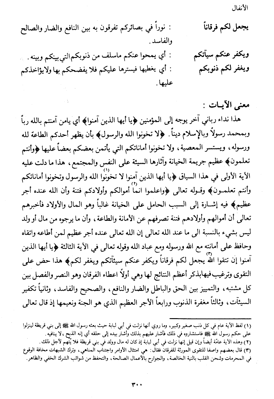 هذا نداء رباني آخر يوجه إلى المؤمنين {يا أيها الذين آمنوا} أي يا من آمنتم بالله رباً وبمحمد رسولاً وبالإسلام ديناً. {لا تخونوا الله والرسول} بأن يظهر أحدكم الطاعة لله ورسوله، ويستسر المعصية، ولا تخونوا أماناتكم التي يأتمن بعضكم بعضاً عليها {وأنتم تعلمون} عظيم جريمة الخيانة وآثارها السيئة على النفس والمجتمع، هذا ما دلت عليه الآية الأولى في هذا السياق {يا أيها الذين آمنوا لا تخونوا1 الله والرسول وتخونوا أماناتكم وأنتم تعلمون} وقوله تعالى {واعلموا إنما2 أموالكم وأولادكم فتنة وأن الله عنده أجر عظيم} فيه إشارة إلى السبب الحامل على الخيانة غالباً وهو المال والأولاد فأخبرهم تعالى أن أموالهم وأولادهم فتنة تصرفهم عن الأمانة والطاعة، وأن ما يرجوه من مال أو ولد ليس بشيء بالنسبة إلى ما عند الله تعالى إن الله تعالى عنده أجر عظيم لمن أطاعه واتقاه وحافظ على أمانته مع الله ورسوله ومع عباد الله وقوله تعالى في الآية الثالثة {يا أيها الذين آمنوا إن تتقوا الله3 يجعل لكم فرقاناً ويكفر عنكم سيئآتكم ويغفر لكم} هذا حض على التقوى وترغيب فيها بذكر أعظم النتائج لها وهي أولاً إعطاء الفرقان وهو النصر والفصل بين كل مشتبه، والتمييز بين الحق والباطل والضار والنافع، والصحيح والفاسد، وثانياً تكفير السيئآت، وثالثاً مغفرة الذنوب ورابعاً الأجر العظيم الذي هو الجنة ونعيمها إذ قال تعالى