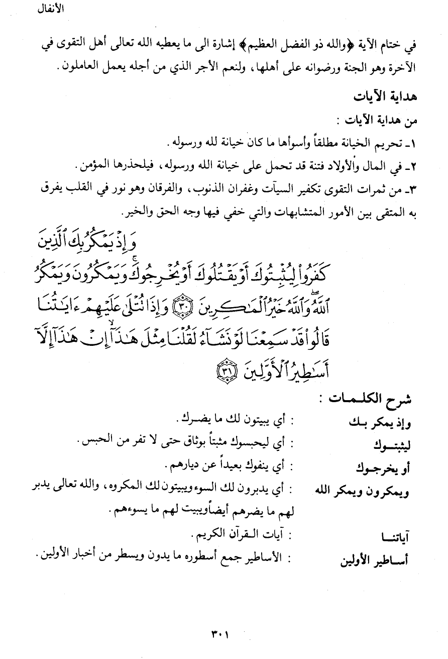 وَإِذْ يَمْكُرُ بِكَ الَّذِينَ كَفَرُواْ لِيُثْبِتُوكَ أَوْ يَقْتُلُوكَ أَوْ يُخْرِجُوكَ وَيَمْكُرُونَ وَيَمْكُرُ اللهُ وَاللهُ خَيْرُ الْمَاكِرِينَ (30) وَإِذَا تُتْلَى عَلَيْهِمْ آيَاتُنَا قَالُواْ قَدْ سَمِعْنَا لَوْ نَشَاء لَقُلْنَا مِثْلَ هَذَا إِنْ هَذَا إِلاَّ أَسَاطِيرُ الأوَّلِينَ (31)