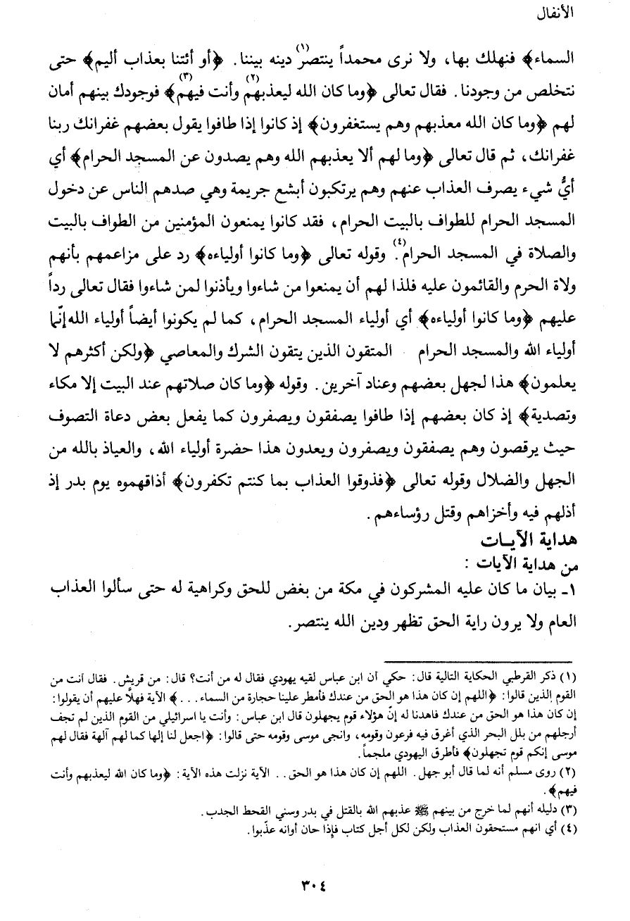 السماء} فنهلك بها، ولا نرى محمداً ينتصر1 دينه بيننا. {أو ائتنا بعذاب أليم} حتى نتخلص من وجودنا. فقال تعالى {وما كان الله ليعذبهم2 وأنت فيهم3} فوجودك بينهم أمان لهم {وما كان الله معذبهم وهم يستغفرون} إذ كانوا إذا طافوا يقول بعضهم غفرانك ربنا غفرانك، ثم قال تعالى {وما لهم ألا يعذبهم الله وهم يصدون عن المسجد الحرام} أي أيُّ شيء يصرف العذاب عنهم وهم يرتكبون أبشع جريمة وهي صدهم الناس عن دخول المسجد الحرام للطواف بالبيت الحرام، فقد كانوا يمنعون المؤمنين من الطواف بالبيت والصلاة في المسجد الحرام4. وقوله تعالى {وما كانوا أولياءه} رد على مزاعمهم بأنهم ولاة الحرم والقائمون عليه فلذا لهم أن يمنعوا من شاءوا ويأذنوا لمن شاءوا فقال تعالى رداً عليهم {وما كانوا أولياءه} أي أولياء المسجد الحرام، كما لم يكونوا أيضاً أولياء الله إنّما أولياء الله والمسجد الحرام المتقون الذين يتقون الشرك والمعاصي {ولكن أكثرهم لا يعلمون} هذا لجهل بعضهم وعناد آخرين. وقوله {وما كان صلاتهم عند البيت إلا مكاء وتصدية} إذ كان بعضهم إذا طافوا يصفقون ويصفرون كما يفعل بعض دعاة التصوف حيث يرقصون وهم يصفقون ويصفرون ويعدون هذا حضرة أولياء الله، والعياذ بالله من الجهل والضلال وقوله تعالى {فذوقوا العذاب بما كنتم تكفرون} أذاقهموه يوم بدر إذ أذلهم فيه وأخزاهم وقتل رؤساءهم.