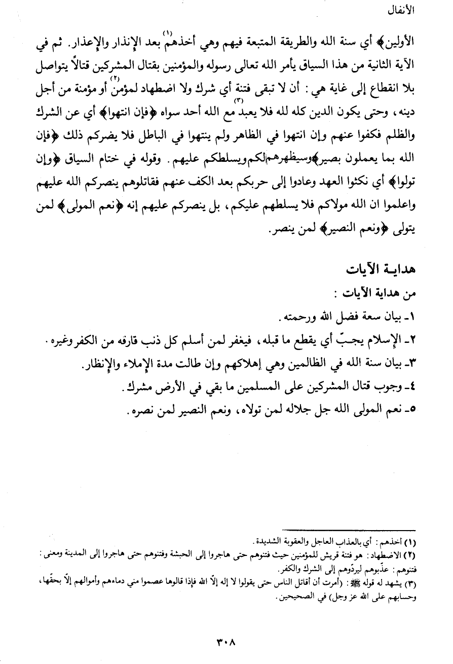 الأولين} أي سنة الله والطريقة المتبعة فيهم وهي أخذهم1 بعد الإنذار والإعذار. ثم في الآية الثانية من هذا السياق يأمر الله تعالى رسوله والمؤمنين بقتال المشركين قتالاً يتواصل بلا انقطاع إلى غاية هي: أن لا تبقى فتنة أي شرك ولا اضطهاد لمؤمن2 أو مؤمنة من أجل دينه، وحتى يكون الدين كله لله فلا يعبد3 مع الله أحد سواه {فإن انتهوا} أي عن الشرك والظلم فكفوا عنهم وإن انتهوا في الظاهر ولم ينتهوا في الباطل فلا يضركم ذلك {فإن الله بما يعملون بصير} وسيظهرهم لكم ويسلطكم عليهم. وقوله في ختام السياق {وإن تولوا} أي نكثوا العهد وعادوا إلى حربكم بعد الكف عنهم فقاتلوهم ينصركم الله عليهم واعلموا أن الله مولاكم فلا يسلطهم عليكم، بل ينصركم عليهم إنه {نعم المولى} لمن يتولى {ونعم النصير} لمن ينصر.