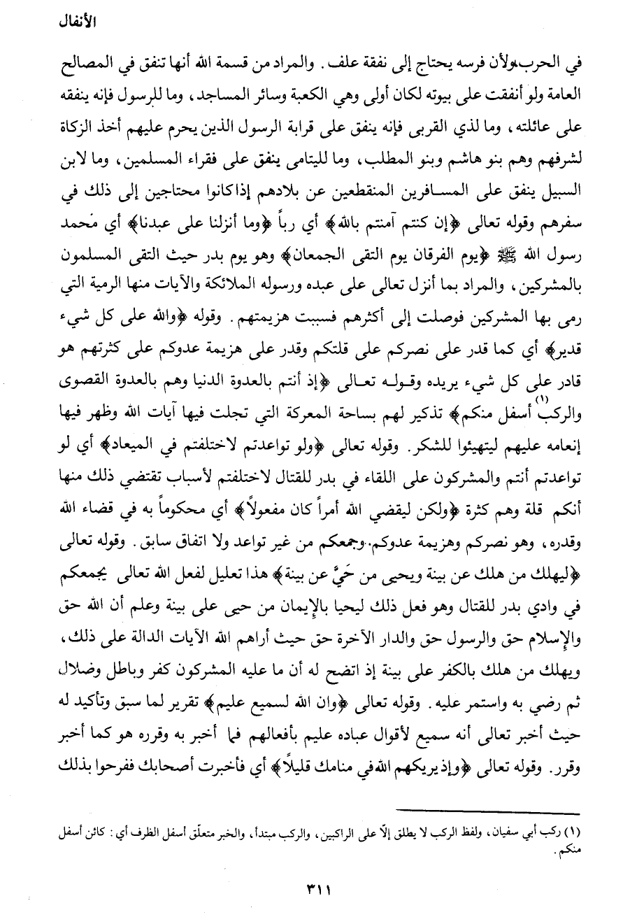 في الحرب، ولأن فرسه يحتاج إلى نفقة علف. والمراد من قسمة الله أنها تنفق في المصالح العامة ولو أنفقت على بيوته لكان أولى وهي الكعبة وسائر المساجد، وما للرسول فإنه ينفقه على عائلته، وما لذي القربى فإنه ينفق على قرابة الرسول الذين يحرم عليهم أخذ الزكاة لشرفهم وهم بنو هاشم وبنو المطلب، وما لليتامى ينفق على فقراء المسلمين، وما لابن السبيل ينفق على المسافرين المنقطعين عن بلادهم إذا كانوا محتاجين إلى ذلك في سفرهم وقوله تعالى {إن كنتم آمنتم بالله} أي رباً {وما أنزلنا على عبدنا} أي محمد رسول الله صَلَّى اللهُ عَلَيْهِ وَسَلَّمَ {يوم الفرقان يوم التقى الجمعان} وهو يوم بدر حيث التقى المسلمون بالمشركين، والمراد بما أنزل تعالى على عبده ورسوله الملائكة والآيات منها الرمية التي رمى بها المشركين فوصلت إلى أكثرهم فسببت هزيمتهم. وقوله {والله على كل شيء قدير} أي كما قدر على نصركم على قلتكم وقدر على هزيمة عدوكم على كثرتهم هو قادر على كل شيء يريده وقوله تعالى {إذ أنتم بالعدوة الدنيا وهم بالعدوة القصوى والركب1 أسفل منكم} تذكير لهم بساحة المعركة التي تجلت فيها آيات الله وظهر فيها إنعامه عليهم ليتهيئوا للشكر. وقوله تعالى {ولو تواعدتم لاختلفتم في الميعاد} أي لو تواعدتم أنتم والمشركون على اللقاء في بدر للقتال لاختلفتم لأسباب تقتضي ذلك منها أنكم قلة وهم كثرة {ولكن ليقضي الله أمراً كان مفعولاً} أي محكوماً به في قضاء الله وقدره، وهو نصركم وهزيمة عدوكم. وجمعكم من غير تواعد ولا اتفاق سابق. وقوله تعالى {ليهلك من هلك عن بينة ويحيى من حَيَّ عن بينة} هذا تعليل لفعل الله تعالى يجمعكم في وادي بدر للقتال وهو فعل ذلك ليحيا بالإيمان من حيى على بينة وعلم أن الله حق والإسلام حق والرسول حق والدار الآخرة حق حيث أراهم الله الآيات الدالة على ذلك، ويهلك من هلك بالكفر على بينة إذ أتضح له أن ما عليه المشركون كفر وباطل وضلال ثم رضي به واستمر عليه. وقوله تعالى {وإن الله لسميع عليم} تقرير لما سبق وتأكيد له حيث أخبر تعالى أنه سميع لأقوال عباده عليم بأفعالهم فما أخبر به وقرره هو كما أخبر وقرر. وقوله تعالى {وإذ يريكهم الله في منامك قليلاً} أي فأخبرت أصحابك ففرحوا بذلك