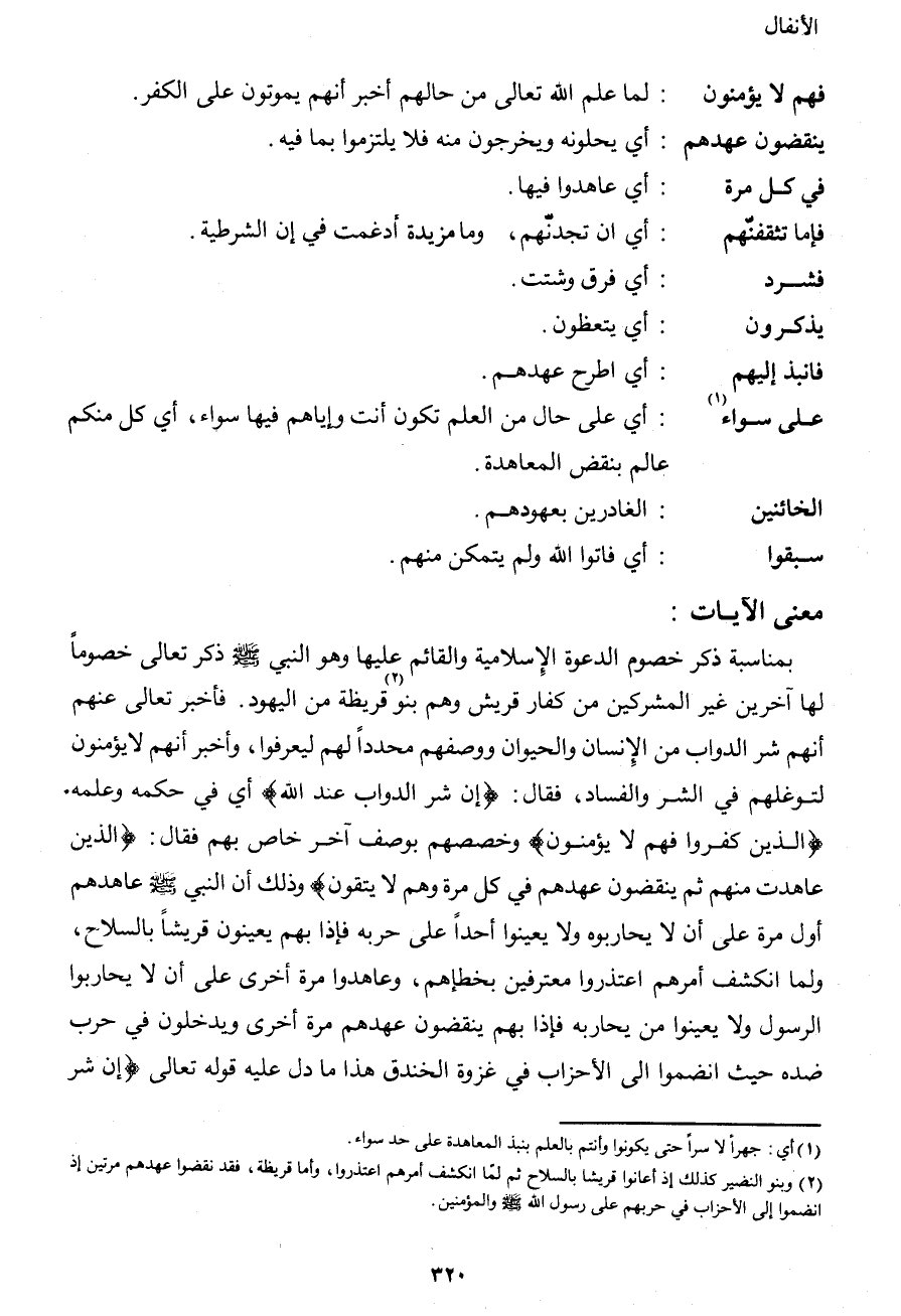 بمناسبة ذكر خصوم الدعوة الإسلامية والقائم عليها وهو النبي صَلَّى اللهُ عَلَيْهِ وَسَلَّمَ ذكر تعالى خصوماً لها آخرين غير المشركين من كفار قريش وهم بنو2 قريظة من اليهود. فأخبر تعالى عنهم أنهم شر الدواب من الإنسان والحيوان ووصفهم محدداً لهم ليعرفوا، وأخبر أنهم لا يؤمنون لتوغلهم في الشر والفساد، فقال: {إن شر الدواب عند الله} أي في حكمه وعلمه. {الذين كفروا فهم لا يؤمنون} وخصصهم بوصف آخر خاص بهم فقال: {الذين عاهدت منهم ثم ينقضون عهدهم في كل مرة وهم لا يتقون} وذلك أن النبي صَلَّى اللهُ عَلَيْهِ وَسَلَّمَ عاهدهم أول مرة على أن لا يحاربوه ولا يعينوا أحداً على حربه فإذا بهم يعينون قريشاً بالسلاح، ولما انكشف أمرهم اعتذروا معترفين بخطإهم، وعاهدوا مرة أخرى على أن لا يحاربوا الرسول ولا يعينوا من يحاربه فإذا بهم ينقضون عهدهم مرة أخرى ويدخلون في حرب ضده حيث انضموا إلى الأحزاب في غزوة الخندق هذا ما دل عليه قوله تعالى {إن شر