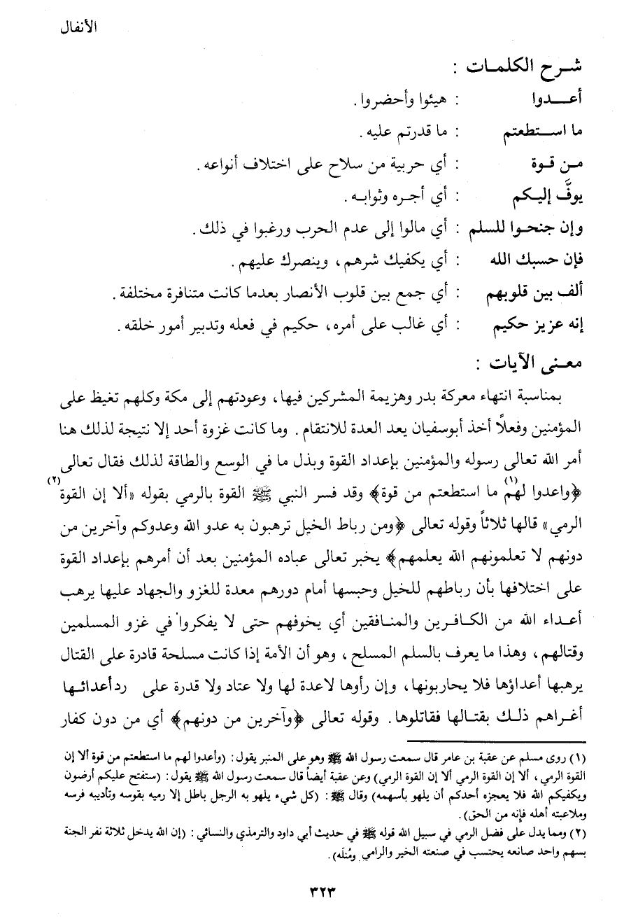 بمناسبة انتهاء معركة بدر وهزيمة المشركين فيها، وعودتهم إلى مكة وكلهم تغيظ على المؤمنين وفعلاً أخذ أبو سفيان يعد العدة للانتقام. وما كانت غزوة أحد إلا نتيجة لذلك هنا أمر الله تعالى رسوله والمؤمنين بإعداد القوة وبذل ما في الوسع والطاقة لذلك فقال تعالى {واعدوا لهم1 ما استطعتم من قوة} وقد فسر النبي صَلَّى اللهُ عَلَيْهِ وَسَلَّمَ القوة بالرمي بقوله "ألا إن القوة2 الرمي" قالها ثلاثاً وقوله تعالى {ومن رباط الخيل ترهبون به عدو الله وعدوكم وآخرين من دونهم لا تعلمونهم الله يعلمهم} يخبر تعالى عباده المؤمنين بعد أن أمرهم بإعداد القوة على اختلافها بأن رباطهم للخيل وحبسها أمام دورهم معدة للغزو والجهاد عليها يرهب أعداء الله من الكافرين والمنافقين أي يخوفهم حتى لا يفكروا في غزو المسلمين وقتالهم، وهذا ما يعرف بالسلم المسلح، وهو أن الأمة إذا كانت مسلحة قادرة على القتال يرهبها أعداؤها فلا يحاربونها، وإن رأوها لا عدة لها ولا عتاد ولا قدرة على رد أعدائها أغراهم ذلك بقتالها فقاتلوها. وقوله تعالى {وآخرين من دونهم} أي من دون كفار