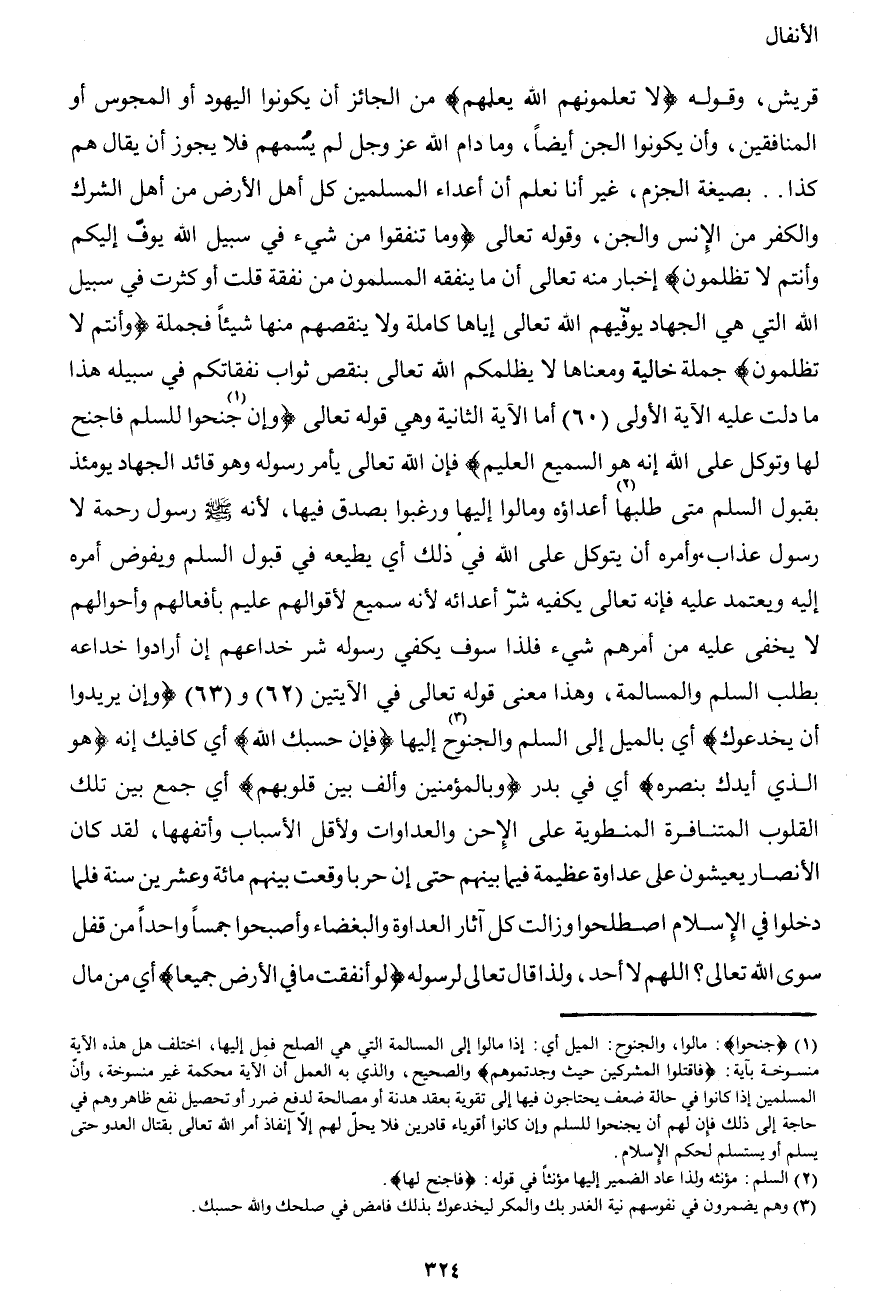 قريش، وقوله {لا تعلمونهم الله يعلهم} من الجائز أن يكونوا اليهود أو المجوس أو المنافقين، وأن يكونوا الجن أيضاً، وما دام الله عز وجل لم يُسمهم فلا يجوز أن يقال هم كذا.. بصيغة الجزم، غير أنا نعلم أن أعداء المسلمين كل أهل الأرض من أهل الشرك والكفر من الإنس والجن، وقوله تعالى {وما تنفقوا من شيء في سبيل الله يوفّ إليكم وأنتم لا تظلمون} إخبار منه تعالى أن ما ينفقه المسلمون من نفقة قلت أو كثرت في سبيل الله التي هي الجهاد يوفّيهم الله تعالى إياها كاملة ولا ينقصهم منها شيئاً فجملة {وأنتم لا تظلمون} جملة خالية ومعناها لا يظلمكم الله تعالى بنقص ثواب نفقاتكم في سبيله هذا ما دلت عليه الآية الأولى (60) أما الآية الثانية وهي قوله تعالى {وإن جنحوا1 للسلم فاجنح لها وتوكل على الله إنه هو السميع العليم} فإن الله تعالى يأمر رسوله وهو قائد الجهاد يومئذ بقبول السلم متى طلبها2 أعداؤه ومالوا إليها ورغبوا بصدق فيها، لأنه صَلَّى اللهُ عَلَيْهِ وَسَلَّمَ رسول رحمة لا رسول عذاب، وأمره أن يتوكل على الله في ذلك أي يطيعه في قبول السلم ويفوض أمره إليه ويعتمد عليه فإنه تعالى يكفيه شرّ أعدائه لأنه سميع لأقوالهم عليم بأفعالهم وأحوالهم لا يخفى عليه من أمرهم شيء فلذا سوف يكفي رسوله شر خداعهم إن أرادوا خداعه بطلب السلم والمسالمة، وهذا معنى توله تعالى في الآيتين (62) و (63) {وإن يريدوا أن يخدعوك} أي بالميل إلى السلم والجنوح3 إليها {فإن حسبك الله} أي كافيك إنه {هو الذي أيدك بنصره} أي في بدر {وبالمؤمنين وألف بين قلوبهم} أي جمع بين تلك القلوب المتنافرة المنطوية على الإحن والعداوات ولأقل الأسباب وأتفهها، لقد كان الأنصار يعيشون على عداوة عظيمة فيما بينهم حتى إن حرباً وقعت بينهم مائة وعشرين سنة فلما دخلوا في الإسلام اصطلحوا وزالت كل آثار العداوة والبغضاء وأصبحوا جسماً واحداً مَنْ فعل هذا سوى الله تعالى؟ اللهم لا أحد، ولذا قال تعالى لرسوله {لو أنفقت ما في الأرض جميعا} أي من مال