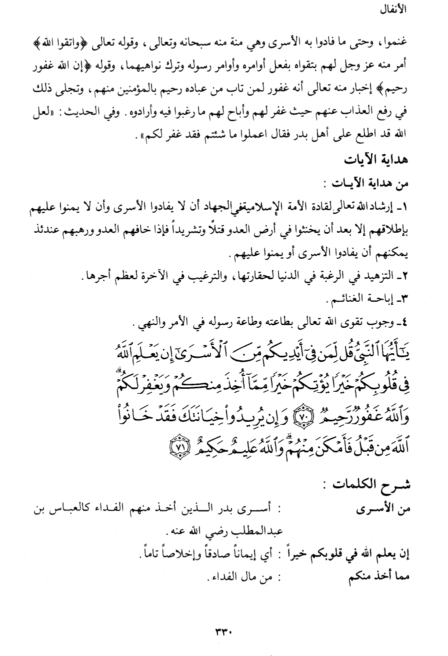 يَا أَيُّهَا النَّبِيُّ قُل لِّمَن فِي أَيْدِيكُم مِّنَ الأَسْرَى إِن يَعْلَمِ اللهُ فِي قُلُوبِكُمْ خَيْرًا يُؤْتِكُمْ خَيْرًا مِّمَّا أُخِذَ مِنكُمْ وَيَغْفِرْ لَكُمْ وَاللهُ غَفُورٌ رَّحِيمٌ (70) وَإِن يُرِيدُواْ خِيَانَتَكَ فَقَدْ خَانُواْ اللهَ مِن قَبْلُ فَأَمْكَنَ مِنْهُمْ وَاللهُ عَلِيمٌ حَكِيمٌ (71)