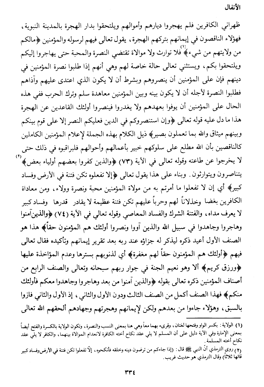 ظهراني الكافرين فلم يهجروا ديارهم وأموالهم ويلتحقوا بدار الهجرة بالمدينة النبوية، فهؤلاء الناقصون في إيمانهم بتركهم الهجرة، يقول تعالى فيهم لرسوله والمؤمنين {مالكم من ولايتهم من شيء} 1 فلا توارث ولا موالاة تقتضي النصرة والمحبة حتى يهاجروا إليكم ويلتحقوا بكم، ويستثني تعالى حالة خاصة لهم وهي أنهم إذا طلبوا نصرة المؤمنين في دينهم فإن على المؤمنين أن ينصروهم وبشرط أن لا يكون الذي اعتدى عليهم وآذاهم فطلبوا النصرة لأجله أن لا يكون بينه وبين المؤمنين معاهدة سلم وترك الحرب ففي هذه الحال على المؤمنين أن يوفوا بعهدهم ولا يغدروا فينصروا أولئك القاعدين عن الهجرة هذا ما دل عليه قوله تعالى {وإن استنصروكم في الدين فعليكم النصر إلا على قوم بينكم وبينهم ميثاق والله بما تعملون بصير} ذيل الكلام بهذه الجملة لإعلام المؤمنين الكاملين كالناقصين بأن الله مطلع على سلوكهم خبير بأعمالهم وأحوالهم فليراقبوه في ذلك حتى لا يخرجوا عن طاعته وقوله تعالى في الآية (73) {والذين كفروا بعضهم أولياء بعض} 2 يتناصرون ويتوارثون. وبناء على هذا يقول تعالى {إلا تفعلوه تكن فتنة في الأرض وفساد كبير} أي إن لا تفعلوا ما أمرتم به من مولاة المؤمنين محبة ونصرة وولاء، ومن معاداة الكافرين بغضا وخذلاناً لهم وحرباً عليهم تكن فتنة عظيمة لا يقادر قدرها وفساد كبير لا يعرف مداه، والفتنة الشرك والفساد المعاصي وقوله تعالي في الآية (74) {والذين آمنوا وهاجروا وجاهدوا في سبيل الله والذين آووا ونصروا أولئك هم المؤمنون حقاً} هذا هو الصنف الأول أعيد ذكره ليذكر له جزاؤه عند ربه بعد تقرير إيمانهم وتأكيده فقال تعالى فيهم {أولئك هم المؤمنون حقاً لهم مغفرة} أي لذنوبهم بسترها وعدم المؤاخذة عليها {ورزق كريم} ألا وهو نعيم الجنة في جوار ربهم سبحانه وتعالى والصنف الرابع من أصناف المؤمنين ذكره تعالى بقوله {والذين آمنوا من بعد وهاجروا وجاهدوا معكم فأولئك منكم} فهذا الصنف أكمل من الصنف الثالث ودون الأول والثاني، إذ الأول والثاني فازوا بالسبق، وهؤلاء جاءوا من بعدهم ولكن لإيمانهم وهجرتهم وجهادهم ألحقهم الله تعالى
