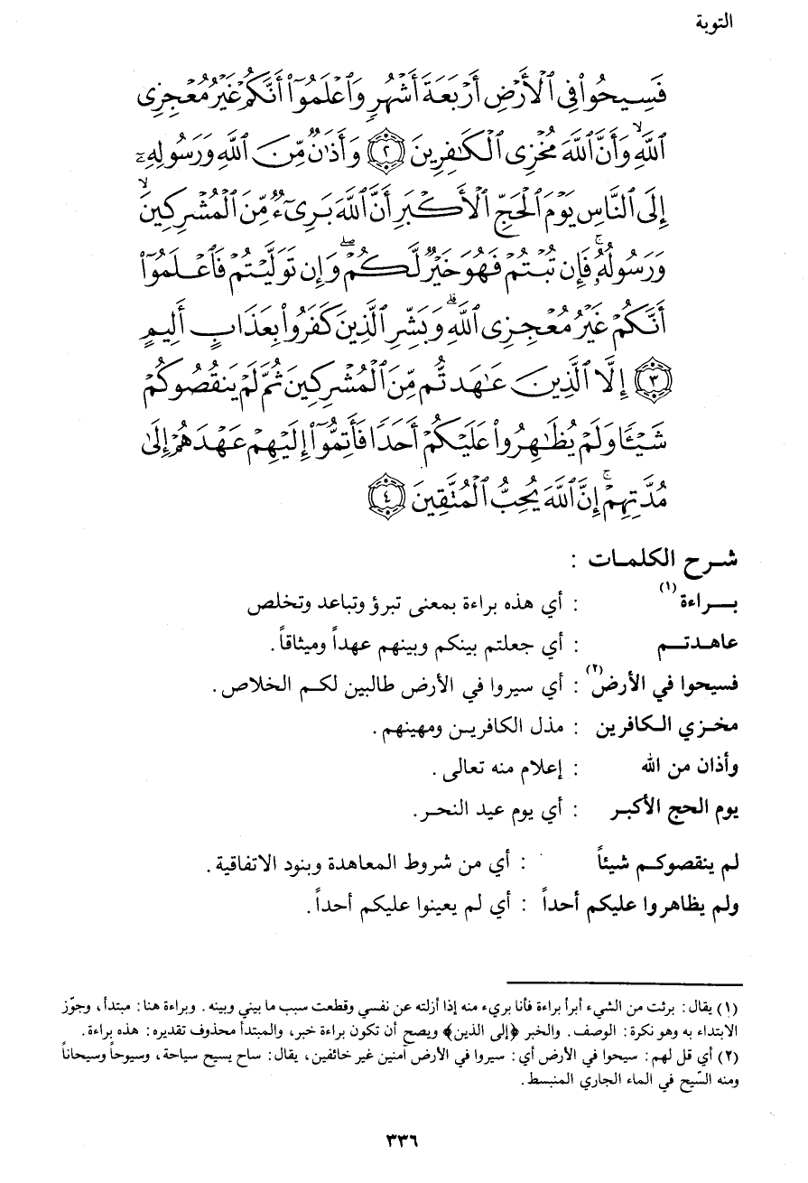 فَسِيحُواْ فِي الأَرْضِ أَرْبَعَةَ أَشْهُرٍ وَاعْلَمُواْ أَنَّكُمْ غَيْرُ مُعْجِزِي اللهِ وَأَنَّ اللهَ مُخْزِي الْكَافِرِينَ (2) وَأَذَانٌ مِّنَ اللهِ وَرَسُولِهِ إِلَى النَّاسِ يَوْمَ الْحَجِّ الأَكْبَرِ أَنَّ اللهَ بَرِيءٌ مِّنَ الْمُشْرِكِينَ وَرَسُولُهُ فَإِن تُبْتُمْ فَهُوَ خَيْرٌ لَّكُمْ وَإِن تَوَلَّيْتُمْ فَاعْلَمُواْ أَنَّكُمْ غَيْرُ مُعْجِزِي اللهِ وَبَشِّرِ الَّذِينَ كَفَرُواْ بِعَذَابٍ أَلِيمٍ (3) إِلاَّ الَّذِينَ عَاهَدتُّم مِّنَ الْمُشْرِكِينَ ثُمَّ لَمْ يَنقُصُوكُمْ شَيْئًا وَلَمْ يُظَاهِرُواْ عَلَيْكُمْ أَحَدًا فَأَتِمُّواْ إِلَيْهِمْ عَهْدَهُمْ إِلَى مُدَّتِهِمْ إِنَّ اللهَ يُحِبُّ الْمُتَّقِينَ (4)