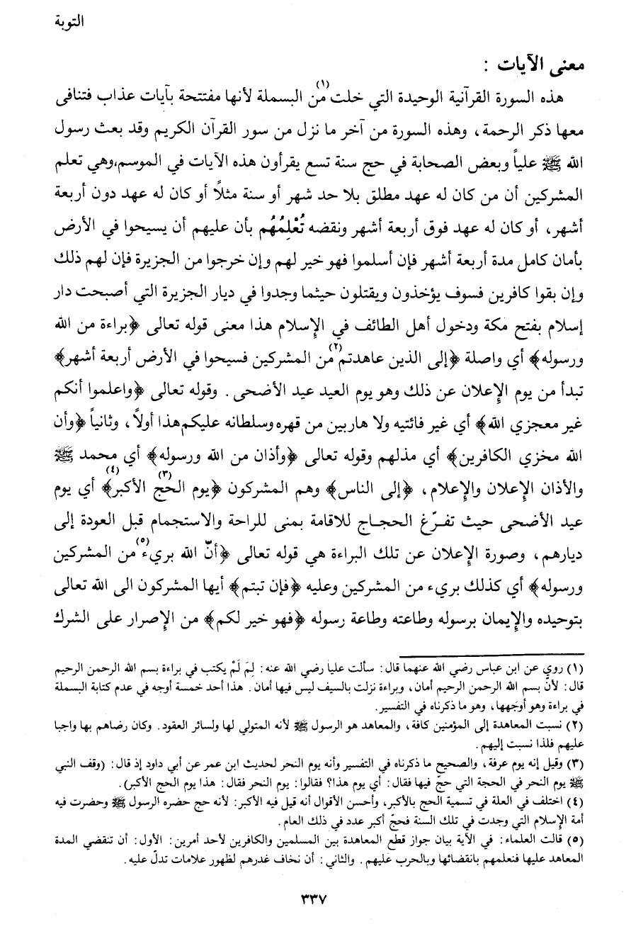 1 روي عن ابن عباس رضي الله عنهما قال: سألت علياً رضي الله عنه: لِمَ لَمْ يكتب في براءة بسم الله الرحمن الرحيم قال: لأن بسم الله الرحمن الرحيم أمان، وبراءة نزلت بالسيف ليس فيها أمان. هذا أحد خمسة أوجه في عدم كتابة البسملة في براءة وهو أوجهها، وهو ما ذكرناه في التفسير.