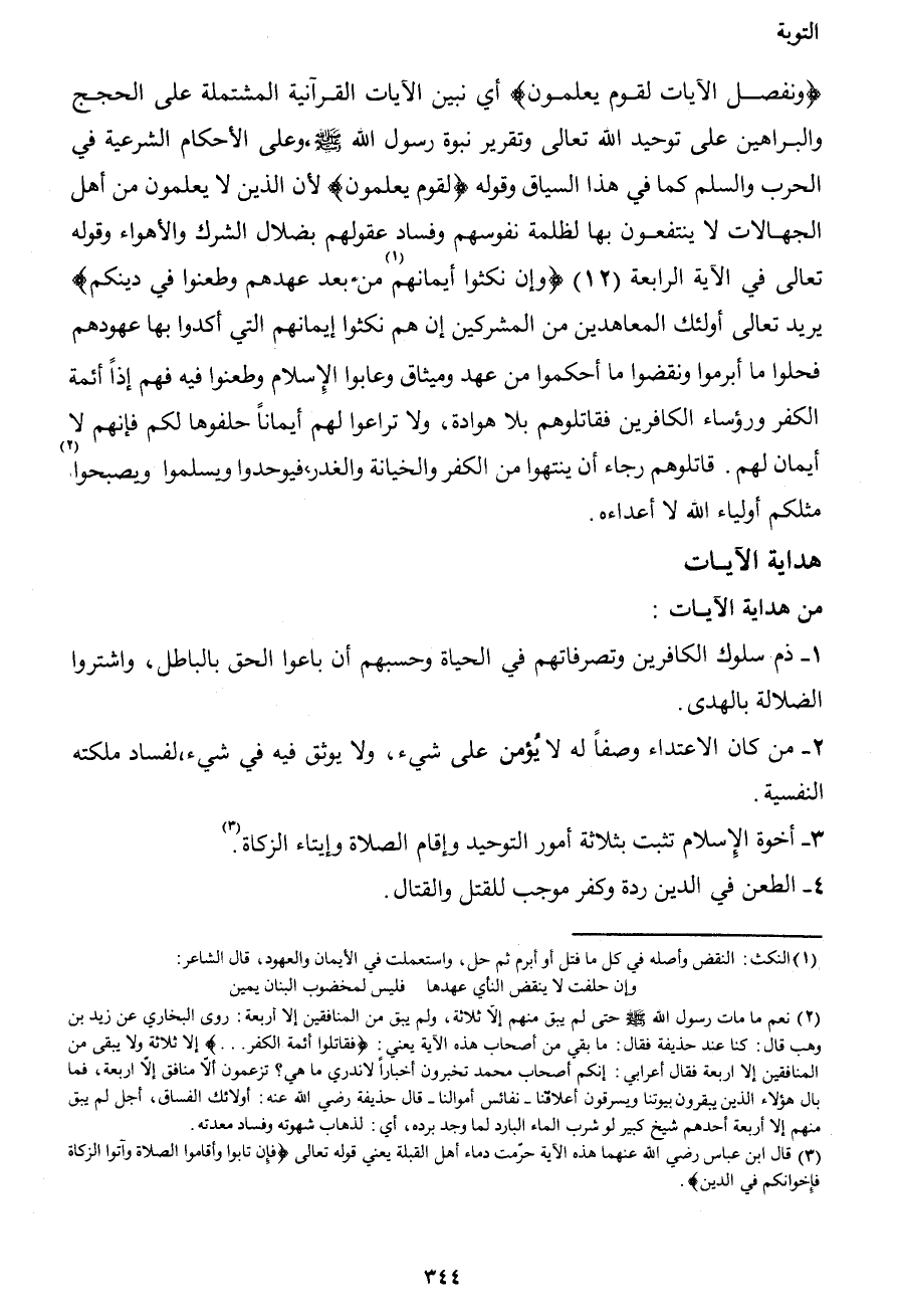 {ونفصل الآيات لقوم يعلمون} أي نبين الآيات القرآنية المشتملة على الحجج والبراهين على توحيد الله تعالى وتقرير نبوة رسول الله صَلَّى اللهُ عَلَيْهِ وَسَلَّمَ، وعلى الأحكام الشرعية في الحرب والسلم كما في هذا السياق وقوله {لقوم يعلمون} لأن الذين لا يعلمون من أهل الجهالات لا ينتفعون بها لظلمة نفوسهم وفساد عقولهم بضلال الشرك والأهواء وقوله تعالى في الآية الرابعة (12) {وإن نكثوا أيمانهم1 من بعد عهدهم وطعنوا في دينكم} يريد تعالى أولئك المعاهدين من المشركين إذ هم نكثوا أيمانهم التي أكدوا بها عهودهم فحلوا ما أبرموا ونقضوا ما أحكموا من عهد وميثاق وعابوا الإسلام وطعنوا فيه فهم إذاً أئمة الكفر ورؤساء الكافرين فقاتلوهم بلا هوادة، ولا تراعوا لهم أيماناً حلفوها لكم فإنهم لا أيمان لهم. قاتلوهم رجاء أن ينتهوا من الكفر والخيانة والغدر فيوحدوا ويسلموا ويصبحوا2 مثلكم أولياء الله لا أعداءه.