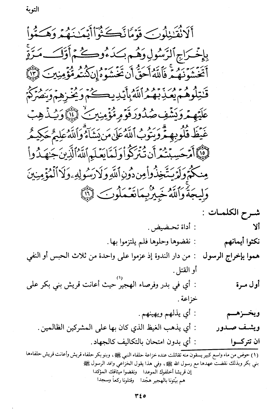أَلاَ تُقَاتِلُونَ قَوْمًا نَّكَثُواْ أَيْمَانَهُمْ وَهَمُّواْ بِإِخْرَاجِ الرَّسُولِ وَهُم بَدَؤُوكُمْ أَوَّلَ مَرَّةٍ أَتَخْشَوْنَهُمْ فَاللهُ أَحَقُّ أَن تَخْشَوْهُ إِن كُنتُم مُّؤُمِنِينَ (13) قَاتِلُوهُمْ يُعَذِّبْهُمُ اللهُ بِأَيْدِيكُمْ وَيُخْزِهِمْ وَيَنصُرْكُمْ عَلَيْهِمْ وَيَشْفِ صُدُورَ قَوْمٍ مُّؤْمِنِينَ (14) وَيُذْهِبْ غَيْظَ قُلُوبِهِمْ وَيَتُوبُ اللهُ عَلَى مَن يَشَاء وَاللهُ عَلِيمٌ حَكِيمٌ (15) أَمْ حَسِبْتُمْ أَن تُتْرَكُواْ وَلَمَّا يَعْلَمِ اللهُ الَّذِينَ جَاهَدُواْ مِنكُمْ وَلَمْ يَتَّخِذُواْ مِن دُونِ اللهِ وَلاَ رَسُولِهِ وَلاَ الْمُؤْمِنِينَ وَلِيجَةً وَاللهُ خَبِيرٌ بِمَا تَعْمَلُونَ (16)