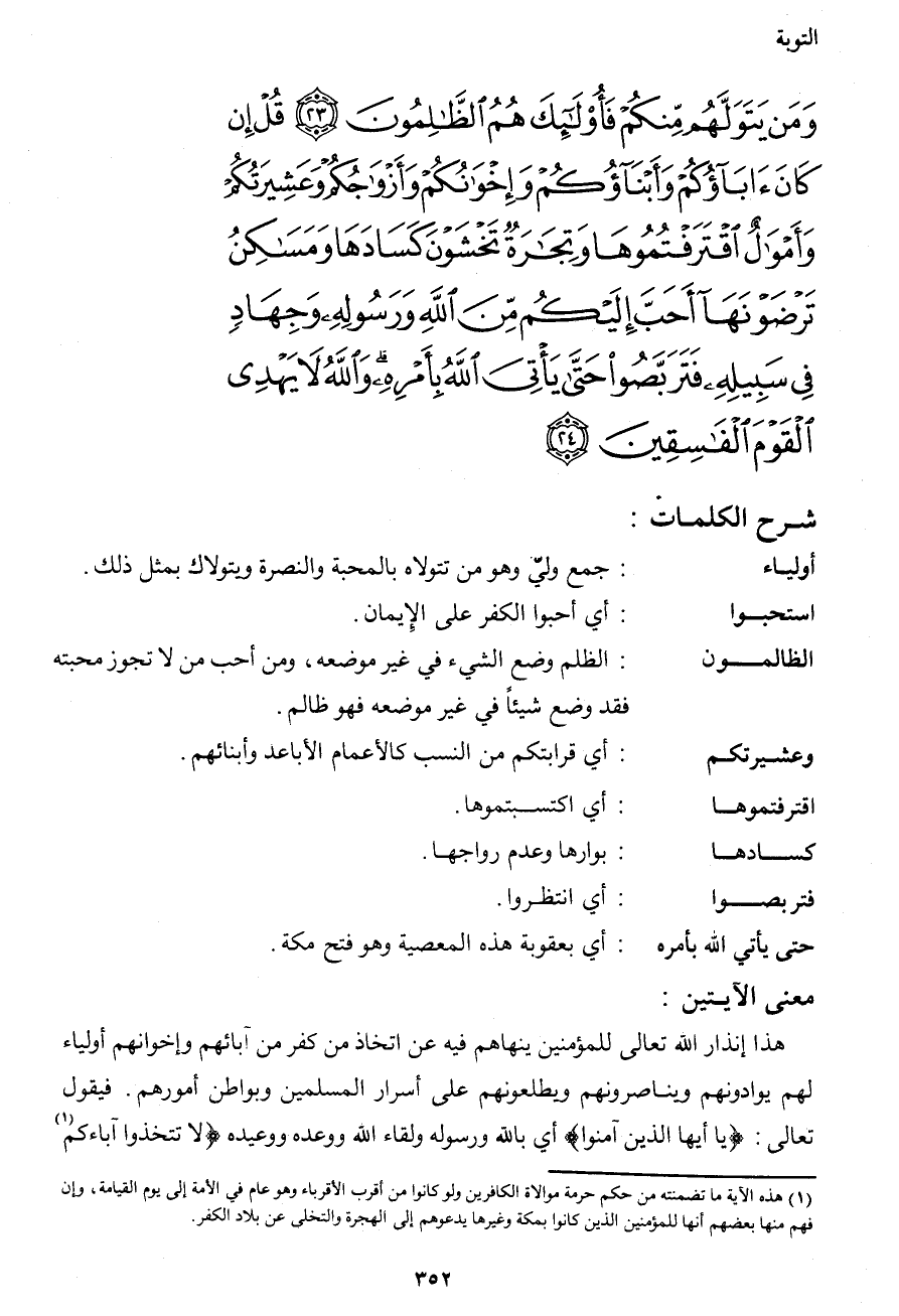 وَمَن يَتَوَلَّهُم مِّنكُمْ فَأُوْلَئِكَ هُمُ الظَّالِمُونَ (23) قُلْ إِن كَانَ آبَاؤُكُمْ وَأَبْنَآؤُكُمْ وَإِخْوَانُكُمْ وَأَزْوَاجُكُمْ وَعَشِيرَتُكُمْ وَأَمْوَالٌ اقْتَرَفْتُمُوهَا وَتِجَارَةٌ تَخْشَوْنَ كَسَادَهَا وَمَسَاكِنُ تَرْضَوْنَهَا أَحَبَّ إِلَيْكُم مِّنَ اللهِ وَرَسُولِهِ وَجِهَادٍ فِي سَبِيلِهِ فَتَرَبَّصُواْ حَتَّى يَأْتِيَ اللهُ بِأَمْرِهِ وَاللهُ لاَ يَهْدِي الْقَوْمَ الْفَاسِقِينَ (24)