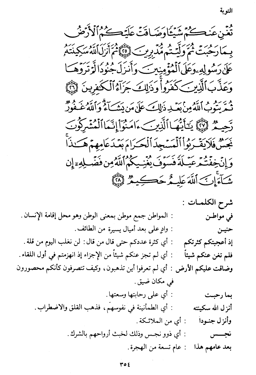 تُغْنِ عَنكُمْ شَيْئًا وَضَاقَتْ عَلَيْكُمُ الأَرْضُ بِمَا رَحُبَتْ ثُمَّ وَلَّيْتُم مُّدْبِرِينَ (25) ثُمَّ أَنَزلَ اللهُ سَكِينَتَهُ عَلَى رَسُولِهِ وَعَلَى الْمُؤْمِنِينَ وَأَنزَلَ جُنُودًا لَّمْ تَرَوْهَا وَعذَّبَ الَّذِينَ كَفَرُواْ وَذَلِكَ جَزَاء الْكَافِرِينَ (26) ثُمَّ يَتُوبُ اللهُ مِن بَعْدِ ذَلِكَ عَلَى مَن يَشَاء وَاللهُ غَفُورٌ رَّحِيمٌ (27) يَا أَيُّهَا الَّذِينَ آمَنُواْ إِنَّمَا الْمُشْرِكُونَ نَجَسٌ فَلاَ يَقْرَبُواْ الْمَسْجِدَ الْحَرَامَ بَعْدَ عَامِهِمْ هَذَا وَإِنْ خِفْتُمْ عَيْلَةً فَسَوْفَ يُغْنِيكُمُ اللهُ مِن فَضْلِهِ إِن شَاء إِنَّ اللهَ عَلِيمٌ حَكِيمٌ (28)