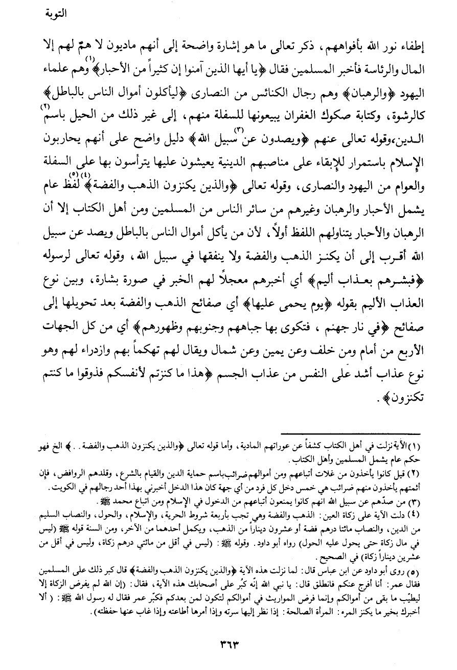إطفاء نور الله بأفواههم، ذكر تعالى ما هو إشارة واضحة إلى أنهم ماديون لا همّ لهم إلا المال والرئاسة فأخبر المسلمين فقال {يا أيها الذين آمنوا إن كثيراً من الأحبار} 1 وهم علماء اليهود {والرهبان} وهم رجال الكنائس من النصارى {ليأكلون أموال الناس بالباطل} كالرشوة، وكتابة صكوك الغفران يبيعونها للسفلة منهم، إلى غير ذلك من الحيل باسم2 الدين، وقوله تعالى عنهم {ويصدون عن3 سبيل الله} دليل واضح على أنهم يحاربون الإسلام باستمرار للإبقاء على مناصبهم الدينية يعيشون عليها يترأسون بها على السفلة والعوام من اليهود والنصارى، وقوله تعالى {والذين يكنزون الذهب والفضة} 4 لفظ5 عام يشمل الأحبار والرهبان وغيرهم من سائر الناس من المسلمين ومن أهل الكتاب إلا أن الرهبان والأحبار يتناولهم اللفظ أولاً، لأن من يأكل أموال الناس بالباطل ويصد عن سبيل الله أقرب إلى أن يكنز الذهب والفضة ولا ينفقها في سبيل الله، وقوله تعالى لرسوله {فبشرهم بعذاب أليم} أي أخبرهم معجلاً لهم الخبر في صورة بشارة، وبين نوع العذاب الأليم بقوله {يوم يحمى عليها} أي صفائح الذهب والفضة بعد تحويلها إلى صفائح {في نار جهنم} فتكوى بها جباههم وجنوبهم وظهورهم} أي من كل الجهات الأربع من أمام ومن خلف وعن يمين وعن شمال ويقال لهم تهكماً بهم وازدراء لهم وهو نوع عذاب أشد على النفس من عذاب الجسم (هذا ما كنزتم لأنفسكم فذوقوا ما كنتم تكنزون} .