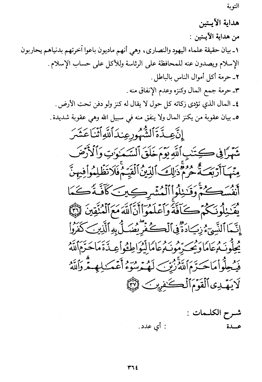 إِنَّ عِدَّةَ الشُّهُورِ عِندَ اللهِ اثْنَا عَشَرَ شَهْرًا فِي كِتَابِ اللهِ يَوْمَ خَلَقَ السَّمَاوَات وَالأَرْضَ مِنْهَا أَرْبَعَةٌ حُرُمٌ ذَلِكَ الدِّينُ الْقَيِّمُ فَلاَ تَظْلِمُواْ فِيهِنَّ أَنفُسَكُمْ وَقَاتِلُواْ الْمُشْرِكِينَ كَآفَّةً كَمَا يُقَاتِلُونَكُمْ كَآفَّةً وَاعْلَمُواْ أَنَّ اللهَ مَعَ الْمُتَّقِينَ (36) إِنَّمَا النَّسِيءُ زِيَادَةٌ فِي الْكُفْرِ يُضَلُّ بِهِ الَّذِينَ كَفَرُواْ يُحِلِّونَهُ عَامًا وَيُحَرِّمُونَهُ عَامًا لِّيُوَاطِؤُواْ عِدَّةَ مَا حَرَّمَ اللهُ فَيُحِلُّواْ مَا حَرَّمَ اللهُ زُيِّنَ لَهُمْ سُوءُ أَعْمَالِهِمْ وَاللهُ لاَ يَهْدِي الْقَوْمَ الْكَافِرِينَ (37)