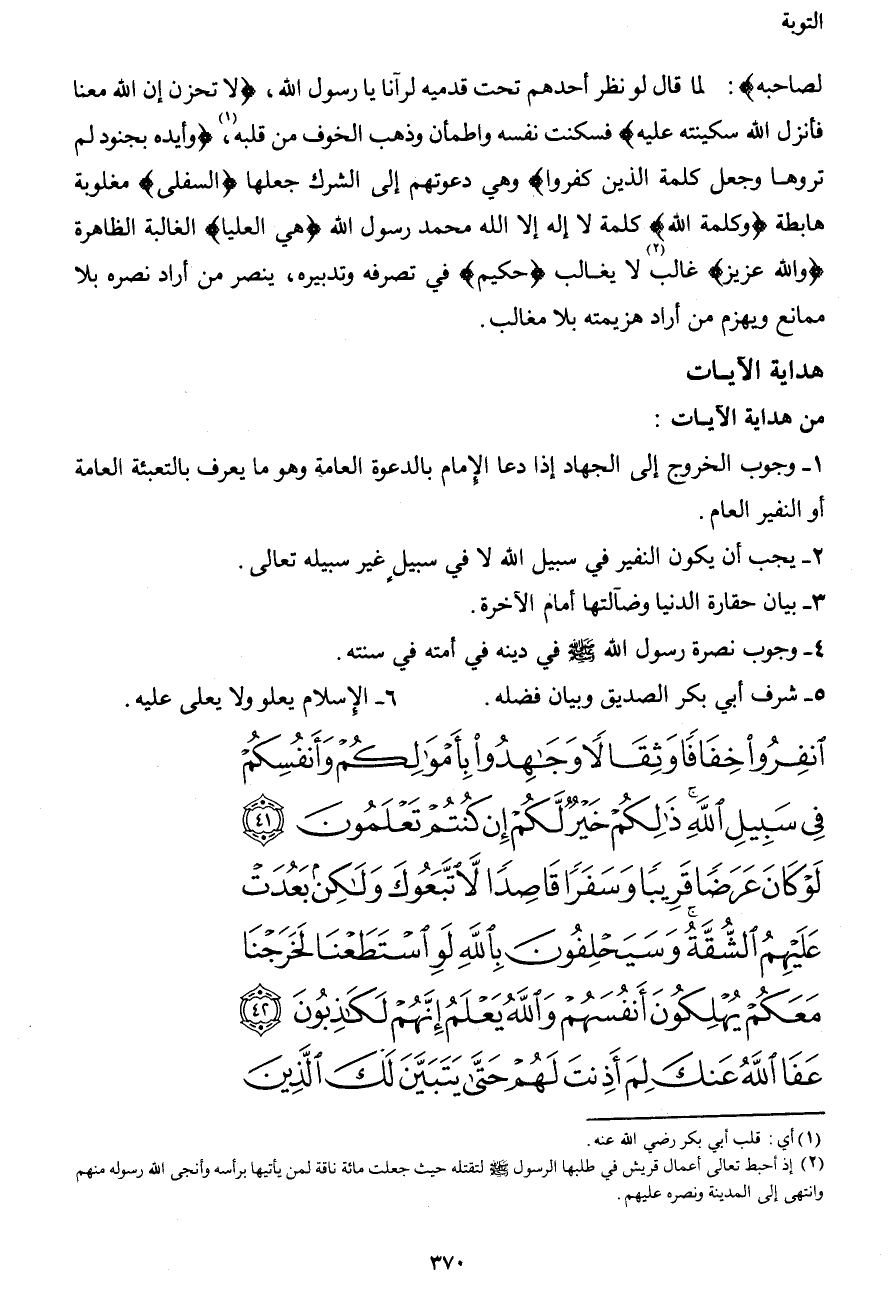 انْفِرُواْ خِفَافًا وَثِقَالاً وَجَاهِدُواْ بِأَمْوَالِكُمْ وَأَنفُسِكُمْ فِي سَبِيلِ اللهِ ذَلِكُمْ خَيْرٌ لَّكُمْ إِن كُنتُمْ تَعْلَمُونَ (41) لَوْ كَانَ عَرَضًا قَرِيبًا وَسَفَرًا قَاصِدًا لاَّتَّبَعُوكَ وَلَكِن بَعُدَتْ عَلَيْهِمُ الشُّقَّةُ وَسَيَحْلِفُونَ بِاللهِ لَوِ اسْتَطَعْنَا لَخَرَجْنَا مَعَكُمْ يُهْلِكُونَ أَنفُسَهُمْ وَاللهُ يَعْلَمُ إِنَّهُمْ لَكَاذِبُونَ (42) عَفَا اللهُ عَنكَ لِمَ أَذِنتَ لَهُمْ حَتَّى يَتَبَيَّنَ لَكَ الَّذِينَ