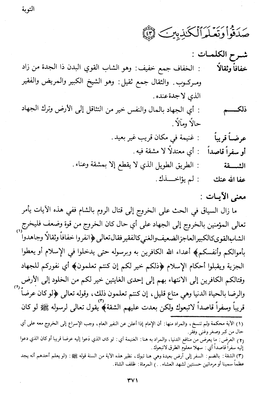 خفافاً وثقالاً: الخفاف جمع خفيف: وهو الشاب القوي البدن ذا الجدة من زاد ومركوب. والثقال جمع ثقيل: وهو الشيخ الكبير والمريض والفقير الذي لا جدة عنده.