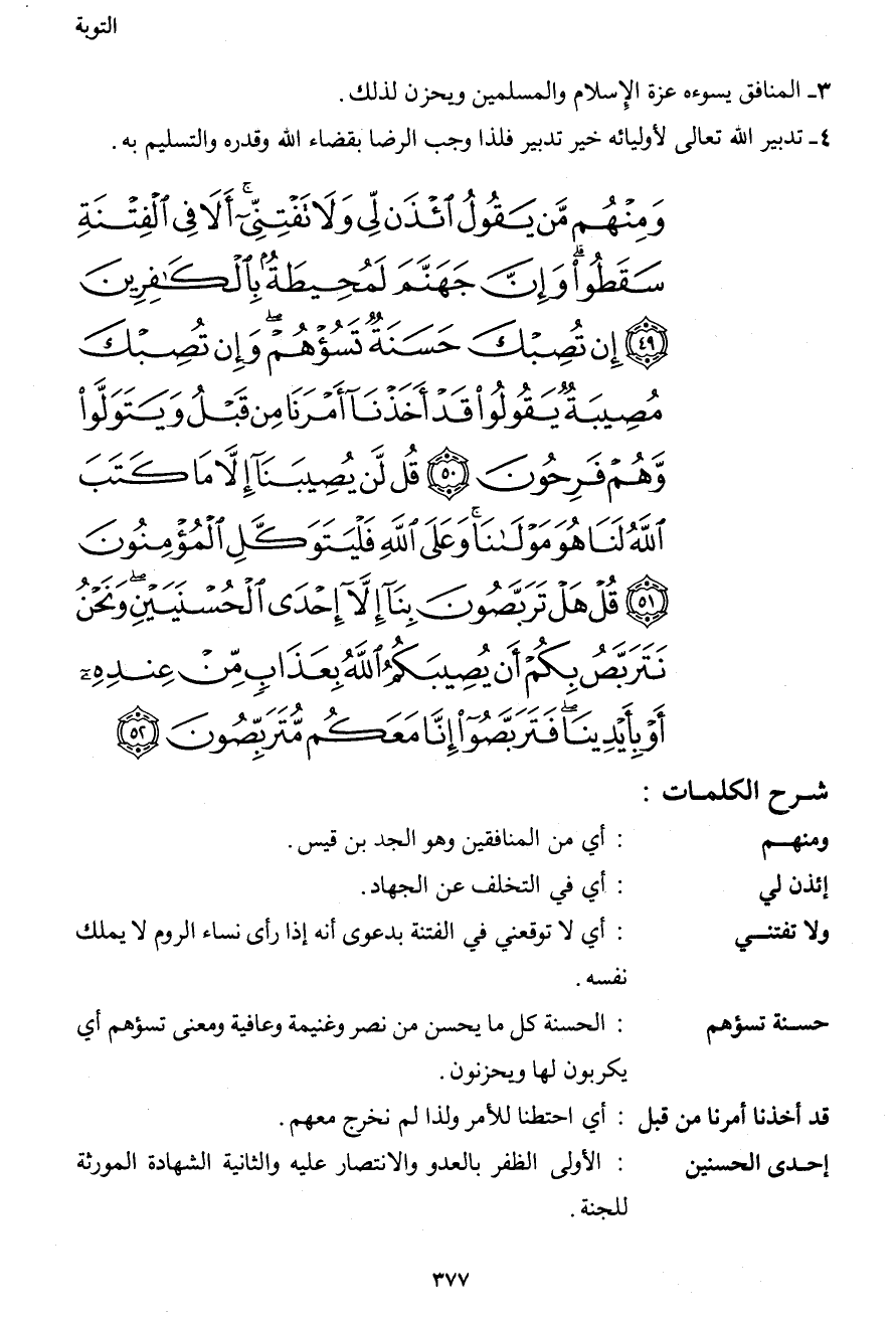 وَمِنْهُم مَّن يَقُولُ ائْذَن لِّي وَلاَ تَفْتِنِّي أَلاَ فِي الْفِتْنَةِ سَقَطُواْ وَإِنَّ جَهَنَّمَ لَمُحِيطَةٌ بِالْكَافِرِينَ (49) إِن تُصِبْكَ حَسَنَةٌ تَسُؤْهُمْ وَإِن تُصِبْكَ مُصِيبَةٌ يَقُولُواْ قَدْ أَخَذْنَا أَمْرَنَا مِن قَبْلُ وَيَتَوَلَّواْ وَّهُمْ فَرِحُونَ (50) قُل لَّن يُصِيبَنَا إِلاَّ مَا كَتَبَ اللهُ لَنَا هُوَ مَوْلاَنَا وَعَلَى اللهِ فَلْيَتَوَكَّلِ الْمُؤْمِنُونَ (51) قُلْ هَلْ تَرَبَّصُونَ بِنَا إِلاَّ إِحْدَى الْحُسْنَيَيْنِ وَنَحْنُ نَتَرَبَّصُ بِكُمْ أَن يُصِيبَكُمُ اللهُ بِعَذَابٍ مِّنْ عِندِهِ أَوْ بِأَيْدِينَا فَتَرَبَّصُواْ إِنَّا مَعَكُم مُّتَرَبِّصُونَ (52)