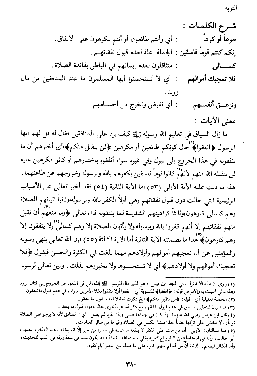 ما زال السياق في تعليم الله تعالى رسوله صَلَّى اللهُ عَلَيْهِ وَسَلَّمَ كيف يرد على المنافقين فقال له قل لهم أيها الرسول {انفقوا} 1 حال كونكم طائعين أو مكرهين {لن يتقبل منكم} ، أي أخبرهم أن ما ينفقونه في هذا الخروج إلى تبوك وفي غيره سواء أنفقوه باختيارهم أو كانوا مكرهين عليه لن يتقبله الله منهم لأنهم2 كانوا قوماً فاسقين بكفرهم بالله وبرسوله وخروجهم عن طاعتهما. هذا ما دلت عليه الآية الأولى (53) أما الآية الثانية (54) فقد أخبر تعالى عن الأسباب الرئيسية التي حالت دون قبول نفقاتهم وهى أولاً الكفر بالله وبرسوله، وثانياً إتيانهم الصلاة وهم كسالى كارهون، وثالثاً كراهيتهم الشديدة لما ينفقونه قال تعالى {وما منعهم3 أن تقبل منهم نفقاتهم إلا أنهم كفروا بالله وبرسوله ولا يأتون الصلاة إلا وهم كسالى4 ولا ينفقون إلا وهم كارهون} 5 هذا ما تضمنته الآية الثانية أما الآية الثالثة (55) فإن الله تعالى ينهى رسوله والمؤمنين عن أن تعجبهم أموالهم وأولادهم مهما بلغت في الكثرة والحسن فيقول {فلا تعجبك أموالهم ولا أولادهم} أي لا تستحسنوها ولا تخبروهم بذلك. وبين تعالى لرسوله