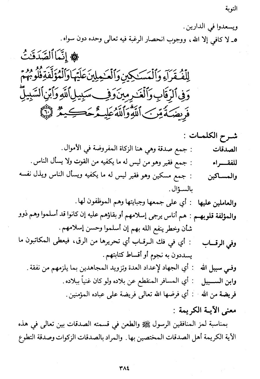 إِنَّمَا الصَّدَقَاتُ لِلْفُقَرَاء وَالْمَسَاكِينِ وَالْعَامِلِينَ عَلَيْهَا وَالْمُؤَلَّفَةِ قُلُوبُهُمْ وَفِي الرِّقَابِ وَالْغَارِمِينَ وَفِي سَبِيلِ اللهِ وَابْنِ السَّبِيلِ فَرِيضَةً مِّنَ اللهِ وَاللهُ عَلِيمٌ حَكِيمٌ (60)