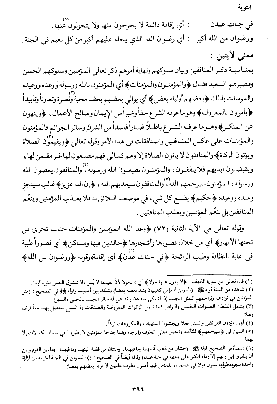 وقوله تعالى في الآية الثانية (72) {وعد الله المؤمنين والمؤمنات جنات تجرى من تحتها الأنهار} أي من خلال قصورها وأشجارها {خالدين فيها ومساكن} أي قصوراً طيبة في غاية النظافة وطيب الرائحة {في جنات عدن6} أي إقامة، وقوله {ورضوان من الله}
