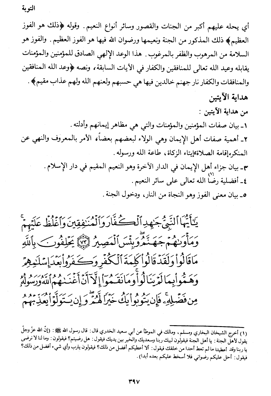 يَا أَيُّهَا النَّبِيُّ جَاهِدِ الْكُفَّارَ وَالْمُنَافِقِينَ وَاغْلُظْ عَلَيْهِمْ وَمَأْوَاهُمْ جَهَنَّمُ وَبِئْسَ الْمَصِيرُ (73) يَحْلِفُونَ بِاللهِ مَا قَالُواْ وَلَقَدْ قَالُواْ كَلِمَةَ الْكُفْرِ وَكَفَرُواْ بَعْدَ إِسْلاَمِهِمْ وَهَمُّواْ بِمَا لَمْ يَنَالُواْ وَمَا نَقَمُواْ إِلاَّ أَنْ أَغْنَاهُمُ اللهُ وَرَسُولُهُ مِن فَضْلِهِ فَإِن يَتُوبُواْ يَكُ خَيْرًا لَّهُمْ وَإِن يَتَوَلَّوْا يُعَذِّبْهُمُ