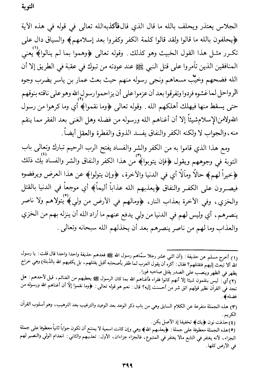 الجلاس يعتذر ويحلف بالله ما قال الذي قال فأكذبه الله تعالى في قوله في هذه الآية {يحلفون بالله ما قالوا ولقد قالوا كلمة الكفر وكفروا بعد إسلامهم} والسياق دال على تكرر مثل هذا القول الخبيث وهو كذلك. وقوله تعالى {وهموا بما لم ينالوا1} يعني المنافقين الذين تآمروا على قتل النبي صَلَّى اللهُ عَلَيْهِ وَسَلَّمَ عند عودته من تبوك في عقبة في الطريق إلا أن الله فضحهم وخيّب مسعاهم ونجى رسوله منهم حيث بعث عمار بن ياسر يضرب وجوه الرواحل لما غشوه فردوا وتفرقوا بعد أن عزموا على أن لزاحموا رسول الله وهو على ناقته بنوقهم حتى يسقط منها فيهلك أهلكهم الله. وقوله تعالى {وما نقموا} 2 أي وما كرهوا من رسول الله ولا من الإسلام شيئاً إلا أن أغناهم الله ورسوله من فضله وهل الغنى بعد الفقر مما ينقم منه، والجواب لا ولكنه الكفر والنفاق يفسد الذوق والفطرة والعقل أيضاً.