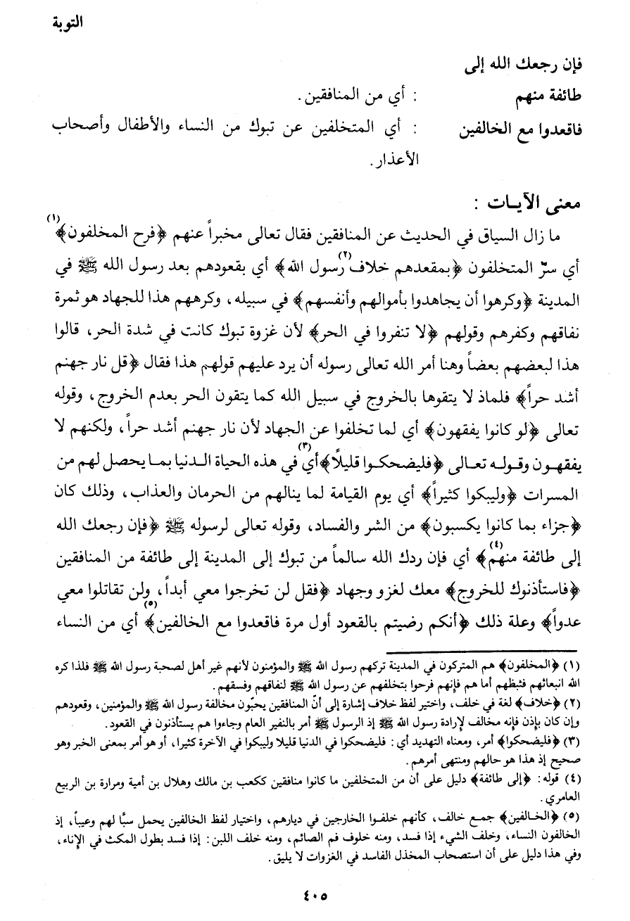 4 قوله: {إلى طائفة} دليل على أن من المتخلفين ما كانوا منافقون ككعب بن مالك وهلال بن أمية ومرارة بن الربيع العامري.