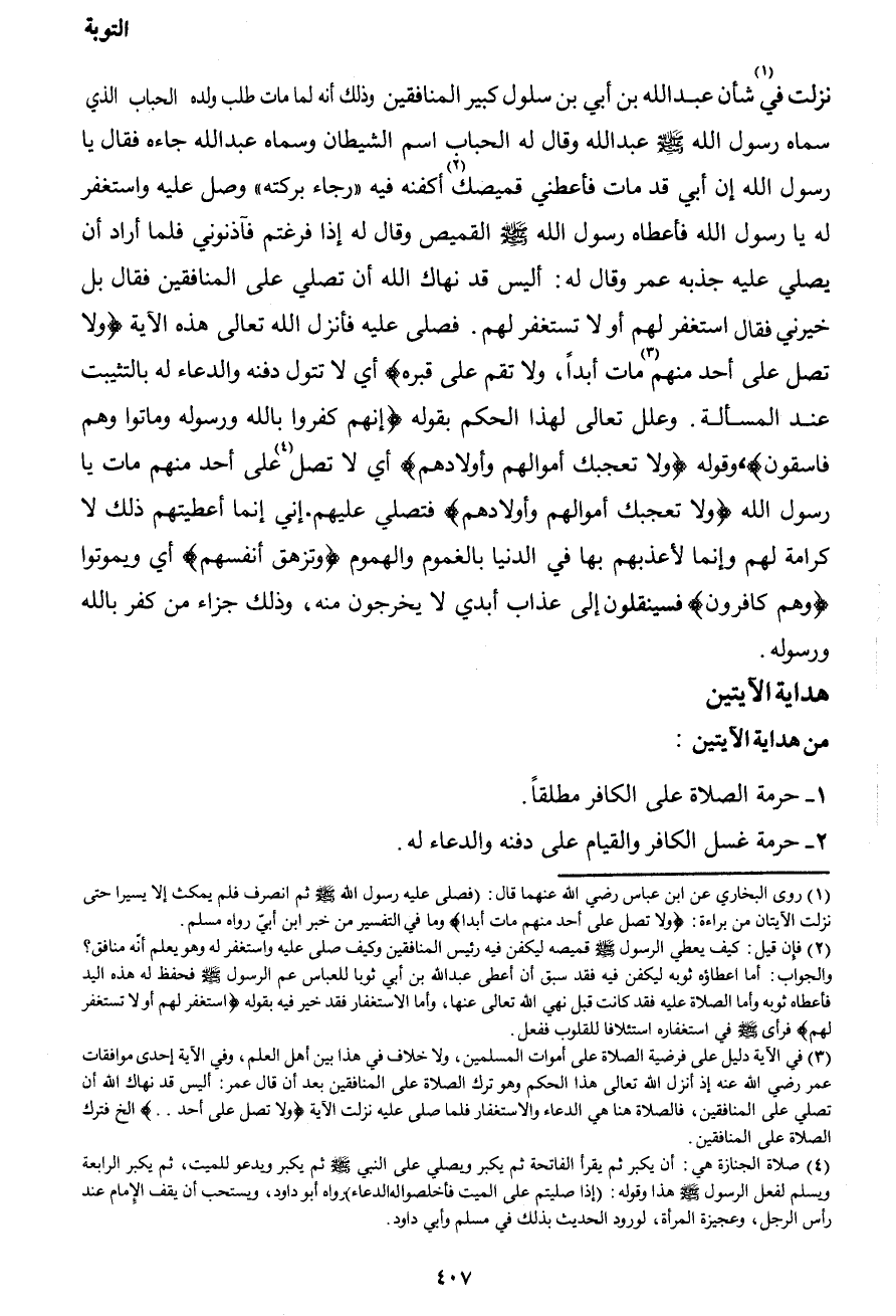 1 روى البخاري عن ابن عباس رضي الله عنهما قال: "فصلى عليه رسول الله صَلَّى اللهُ عَلَيْهِ وَسَلَّمَ ثم انصرف فلم يمكث إلا يسيراً حتى نزلت الآيتان من براءة: {ولا تصل على أحد منهم مات أبداً} وما في التفسير من خبر ابن أبيّ رواه مسلم.