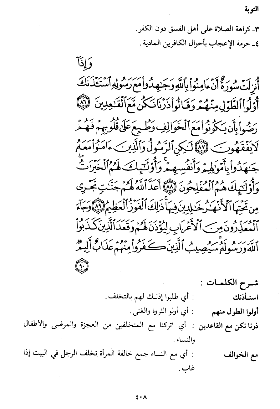وَإِذَآ أُنزِلَتْ سُورَةٌ أَنْ آمِنُواْ بِاللهِ وَجَاهِدُواْ مَعَ رَسُولِهِ اسْتَأْذَنَكَ أُوْلُواْ الطَّوْلِ مِنْهُمْ وَقَالُواْ ذَرْنَا نَكُن مَّعَ الْقَاعِدِينَ (86) رَضُواْ بِأَن يَكُونُواْ مَعَ الْخَوَالِفِ وَطُبِعَ عَلَى قُلُوبِهِمْ فَهُمْ لاَ يَفْقَهُونَ (87) لَكِنِ الرَّسُولُ وَالَّذِينَ آمَنُواْ مَعَهُ جَاهَدُواْ بِأَمْوَالِهِمْ وَأَنفُسِهِمْ وَأُوْلَئِكَ لَهُمُ الْخَيْرَاتُ وَأُوْلَئِكَ هُمُ الْمُفْلِحُونَ (88) أَعَدَّ اللهُ لَهُمْ جَنَّاتٍ تَجْرِي مِن تَحْتِهَا الأَنْهَارُ خَالِدِينَ فِيهَا ذَلِكَ الْفَوْزُ الْعَظِيمُ (89) وَجَاء الْمُعَذِّرُونَ مِنَ الأَعْرَابِ لِيُؤْذَنَ لَهُمْ وَقَعَدَ الَّذِينَ كَذَبُواْ اللهَ وَرَسُولَهُ سَيُصِيبُ الَّذِينَ كَفَرُواْ مِنْهُمْ عَذَابٌ أَلِيمٌ (90)