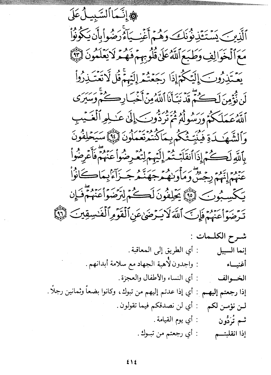 إِنَّمَا السَّبِيلُ عَلَى الَّذِينَ يَسْتَأْذِنُونَكَ وَهُمْ أَغْنِيَاء رَضُواْ بِأَن يَكُونُواْ مَعَ الْخَوَالِفِ وَطَبَعَ اللهُ عَلَى قُلُوبِهِمْ فَهُمْ لاَ يَعْلَمُونَ (93) يَعْتَذِرُونَ إِلَيْكُمْ إِذَا رَجَعْتُمْ إِلَيْهِمْ قُل لاَّ تَعْتَذِرُواْ لَن نُّؤْمِنَ لَكُمْ قَدْ نَبَّأَنَا اللهُ مِنْ أَخْبَارِكُمْ وَسَيَرَى الله عَمَلَكُمْ وَرَسُولُهُ ثُمَّ تُرَدُّونَ إِلَى عَالِمِ الْغَيْبِ وَالشَّهَادَةِ فَيُنَبِّئُكُم بِمَا كُنتُمْ تَعْمَلُونَ (94) سَيَحْلِفُونَ بِاللهِ لَكُمْ إِذَا انقَلَبْتُمْ إِلَيْهِمْ لِتُعْرِضُواْ عَنْهُمْ فَأَعْرِضُواْ عَنْهُمْ إِنَّهُمْ رِجْسٌ وَمَأْوَاهُمْ جَهَنَّمُ جَزَاء بِمَا كَانُواْ يَكْسِبُونَ (95) يَحْلِفُونَ لَكُمْ لِتَرْضَوْاْ عَنْهُمْ فَإِن تَرْضَوْاْ عَنْهُمْ فَإِنَّ اللهَ لاَ يَرْضَى عَنِ الْقَوْمِ الْفَاسِقِينَ (96)