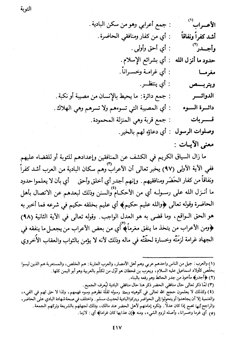 ما زال السياق الكريم في الكشف عن المنافقين وإعدادهم للتوبة أو للقضاء عليهم ففي الآية الأولى (97) يخبر تعالى أن الأعراب3 وهم سكان البادية من العرب أشد كفراً ونفاقاً من كفار الحَضَر ومنافقيهم. وإنهم أجدر أي أخلق وأحق أي بأن لا يعلموا حدود ما أنزل الله على رسوله أي من الأحكام4 والسنن وذلك لبعدهم عن الاتصال بأهل الحاضرة وقوله تعالى {والله عليم حكيم} أي عليم بخلقه حكيم في شرعه فما أخبر به هو الحق الواقع، وما قضى به هو العدل الواجب. وقوله تعالى في الآية الثانية (98) {ومن الأعراب من يتخذ ما ينفق مغرماً} 5 أي من بعض الأعراب من يجعل ما ينفقه في الجهاد غرامة لزمَتْه وخسارة لحقَتْه في ماله وذلك لأنه لا يؤمن بالثواب والعقاب الأخروي