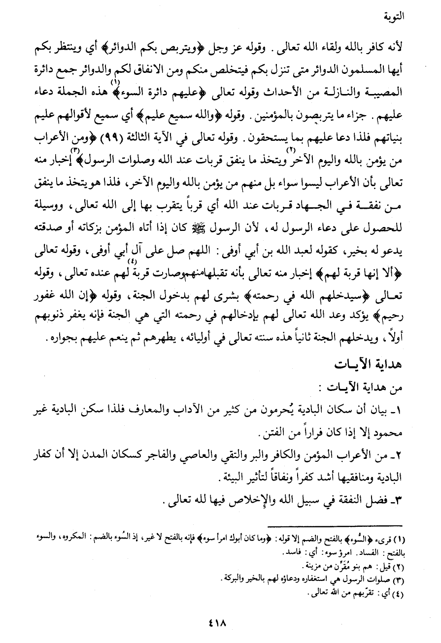 لأنه كافر بالله ولقاء الله تعالى. وقوله عز وجل {ويتربص بكم الدوائر} أي وينتظر بكم أيها المسلمون الدوائر متى تنزل بكم فيتخلص منكم ومن الإنفاق لكم والدوائر جمع دائرة المصيبة والنازلة من الأحداث وقوله تعالى {عليهم دائرة السوء} 1 هذه الجملة دعاء عليهم. جزاء ما يتربصون بالمؤمنين. وقوله {والله سميع عليم} أي سميع لأقوالهم عليم بنيانهم فلذا دعا عليهم بما يستحقون. وقوله تعالى في الآية الثالثة (99) {ومن الأعراب من يؤمن بالله واليوم الآخر2 ويتخذ ما ينفق قربات عند الله وصلوات الرسول} 3 إخبار منه تعالى بأن الأعراب ليسوا سواء بل منهم من يؤمن بالله واليوم الأخر، فلذا هو يتخذ ما ينفق من نفقة في الجهاد قربات عند الله أي قرباً يتقرب بها إلى الله تعالى، ووسيلة للحصول على دعاء الرسول له، لأن الرسول صَلَّى اللهُ عَلَيْهِ وَسَلَّمَ كان إذا أتاه المؤمن بزكاته أو صدقته يدعو له بخير، كقوله لعبد الله بن أبي أوفى: اللهم صل على آل أبي أوفى، وقوله تعالى {ألا إنها قربة لهم} إخبار منه تعالى بأنه تقبلها منهم صارت قربة4 لهم عنده تعالى، وقوله تعالى {سيدخلهم الله في رحمته} بشرى لهم بدخول الجنة، وقوله {إن الله غفور رحيم} يؤكد وعد الله تعالى لهم بإدخالهم في رحمته التي هي الجنة فإنه يغفر ذنوبهم أولاً، ويدخلهم الجنة ثانياً هذه سنته تعالى في أوليائه، يطهرهم ثم ينعم عليهم بجواره.