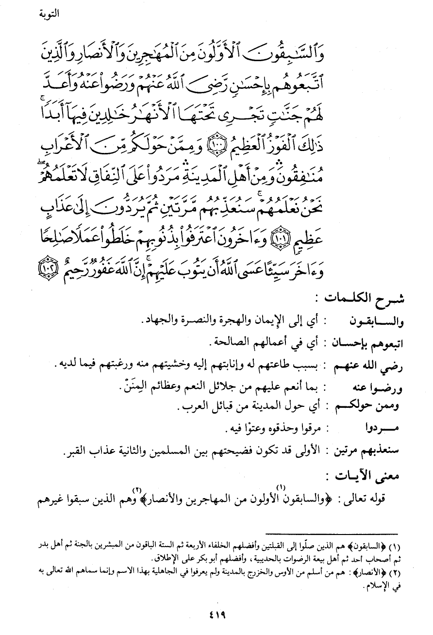 وَالسَّابِقُونَ الأَوَّلُونَ مِنَ الْمُهَاجِرِينَ وَالأَنصَارِ وَالَّذِينَ اتَّبَعُوهُم بِإِحْسَانٍ رَّضِيَ اللهُ عَنْهُمْ وَرَضُواْ عَنْهُ وَأَعَدَّ لَهُمْ جَنَّاتٍ تَجْرِي تَحْتَهَا الأَنْهَارُ خَالِدِينَ فِيهَا أَبَدًا ذَلِكَ الْفَوْزُ الْعَظِيمُ (100) وَمِمَّنْ حَوْلَكُم مِّنَ الأَعْرَابِ مُنَافِقُونَ وَمِنْ أَهْلِ الْمَدِينَةِ مَرَدُواْ عَلَى النِّفَاقِ لاَ تَعْلَمُهُمْ نَحْنُ نَعْلَمُهُمْ سَنُعَذِّبُهُم مَّرَّتَيْنِ ثُمَّ يُرَدُّونَ إِلَى عَذَابٍ عَظِيمٍ (101) وَآخَرُونَ اعْتَرَفُواْ بِذُنُوبِهِمْ خَلَطُواْ عَمَلاً صَالِحًا وَآخَرَ سَيِّئًا عَسَى اللهُ أَن يَتُوبَ عَلَيْهِمْ إِنَّ اللهَ غَفُورٌ رَّحِيمٌ (102)