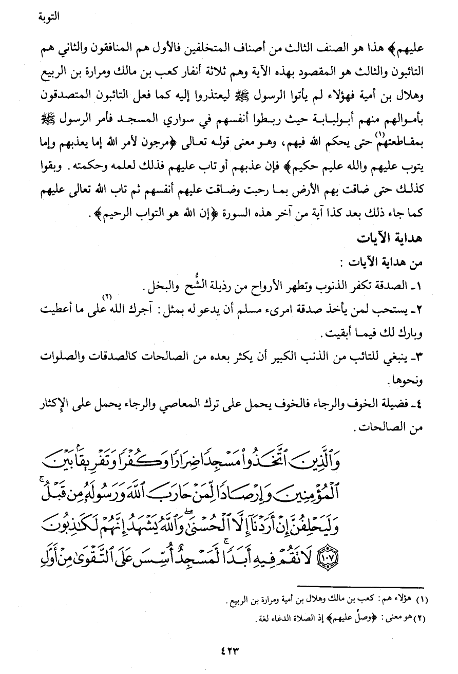 وَالَّذِينَ اتَّخَذُواْ مَسْجِدًا ضِرَارًا وَكُفْرًا وَتَفْرِيقًا بَيْنَ الْمُؤْمِنِينَ وَإِرْصَادًا لِّمَنْ حَارَبَ اللهَ وَرَسُولَهُ مِن قَبْلُ وَلَيَحْلِفَنَّ إِنْ أَرَدْنَا إِلاَّ الْحُسْنَى وَاللهُ يَشْهَدُ إِنَّهُمْ لَكَاذِبُونَ (107) لاَ تَقُمْ فِيهِ أَبَدًا لَّمَسْجِدٌ أُسِّسَ عَلَى التَّقْوَى مِنْ أَوَّلِ