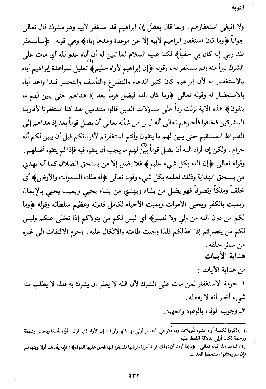 ولا انبغى استغفارهم. ولما قال بعضٌ إن إبراهيم قد استغفر لأبيه وهو مشرك قال تعالى جواباً {وما كان استغفار إبراهيم لأبيه إلا عن موعدة وعدها إياه} وهي قوله: {سأستغفر لك ربي إنه كان بي حفياً} لكنه عليه السلام لما تبين له أن أباه عدو لله أي مات على الشرك تبرأ منه ولم يستغفر له، وقوله {إن إبراهيم لأواه حليم} 1 تعليل لمواعدة إبراهيم أباه بالاستغفار له لأن إبراهيم كان كثير الدعاء والتضرع والتأسف والتحسر فلذا واعد أباه، بالاستغفار له وقوله تعالى {وما كان الله ليضل قوماً بعد إذ هداهم حتى يبين لهم ما يتقون} هذه الآية نزلت رداً على تساؤلات الذين قالوا متندمين لقد كنا استغفرنا لأقاربنا المشركين فخافوا فأخبرهم تعالى أنه ليس من شأنه تعالى أن يضل قوماً بعد إذ هداهم إلى الصراط المستقيم حتى يبين لهم ما يتقون وأنتم استغفرتم لأقربائكم قبل أن يبين لكم أنه حرام. ولكن إذا أراد الله أن يضل قوماً2 بيّن لهم ما يجب أن يتقوه فيه فإذا لم يتقوه أضلهم. وقوله تعالى {إن الله بكل شيء عليم} فلا يضل إلا من يستحق الضلال كما أنه يهدي من يستحق الهداية وذلك لعلمه بكل شيء وقوله تعالى {له ملك السموات والأرض} أي خلقاً وملكاً وتصرفاً فهو يضل من يشاء ويهدي من يشاء يحيى ويميت يحيي بالإيمان ويميت بالكفر ويحيى الأموات ويميت الأحياء لكامل قدرته وعظيم سلطانه وقوله {وما لكم من دون الله من ولي ولا نصير} أي ليس لكم من يتولاكم إذا تخلى عنكم وليس لكم من ينصركم إذا خذلكم فلذا وجبت طاعته والاتكال عليه، وحرم الالتفات إلى غيره من سائر خلقه.