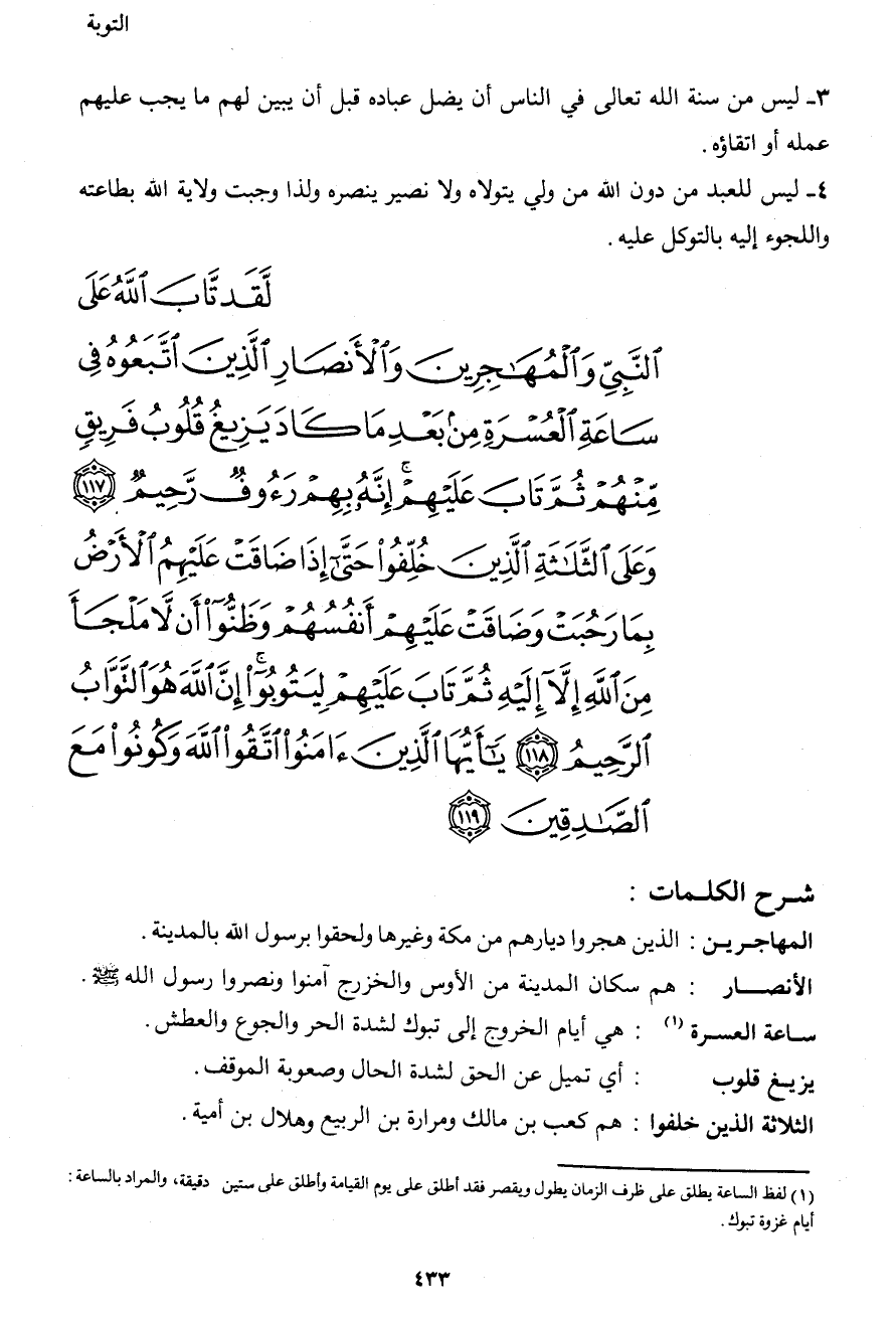 النَّبِيِّ وَالْمُهَاجِرِينَ وَالأَنصَارِ الَّذِينَ اتَّبَعُوهُ فِي سَاعَةِ الْعُسْرَةِ مِن بَعْدِ مَا كَادَ يَزِيغُ قُلُوبُ فَرِيقٍ مِّنْهُمْ ثُمَّ تَابَ عَلَيْهِمْ إِنَّهُ بِهِمْ رَؤُوفٌ رَّحِيمٌ (117) وَعَلَى الثَّلاَثَةِ الَّذِينَ خُلِّفُواْ حَتَّى إِذَا ضَاقَتْ عَلَيْهِمُ الأَرْضُ بِمَا رَحُبَتْ وَضَاقَتْ عَلَيْهِمْ أَنفُسُهُمْ وَظَنُّواْ أَن لاَّ مَلْجَأَ مِنَ اللهِ إِلاَّ إِلَيْهِ ثُمَّ تَابَ عَلَيْهِمْ لِيَتُوبُواْ إِنَّ اللهَ هُوَ التَّوَّابُ الرَّحِيمُ (118) يَا أَيُّهَا الَّذِينَ آمَنُواْ اتَّقُواْ اللهَ وَكُونُواْ مَعَ الصَّادِقِينَ (119)