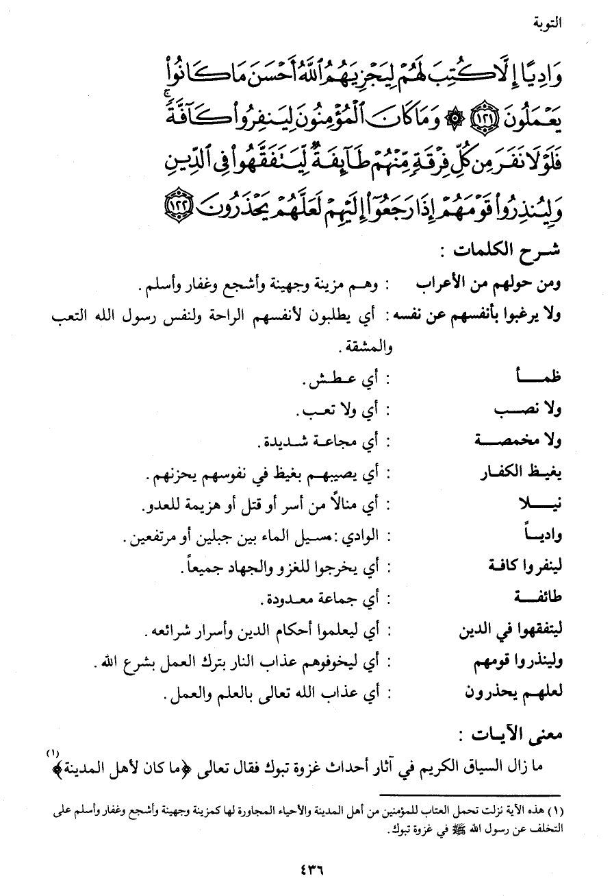 وَادِيًا إِلاَّ كُتِبَ لَهُمْ لِيَجْزِيَهُمُ اللهُ أَحْسَنَ مَا كَانُواْ يَعْمَلُونَ (121) وَمَا كَانَ الْمُؤْمِنُونَ لِيَنفِرُواْ كَآفَّةً فَلَوْلاَ نَفَرَ مِن كُلِّ فِرْقَةٍ مِّنْهُمْ طَآئِفَةٌ لِّيَتَفَقَّهُواْ فِي الدِّينِ وَلِيُنذِرُواْ قَوْمَهُمْ إِذَا رَجَعُواْ إِلَيْهِمْ لَعَلَّهُمْ يَحْذَرُونَ (122)