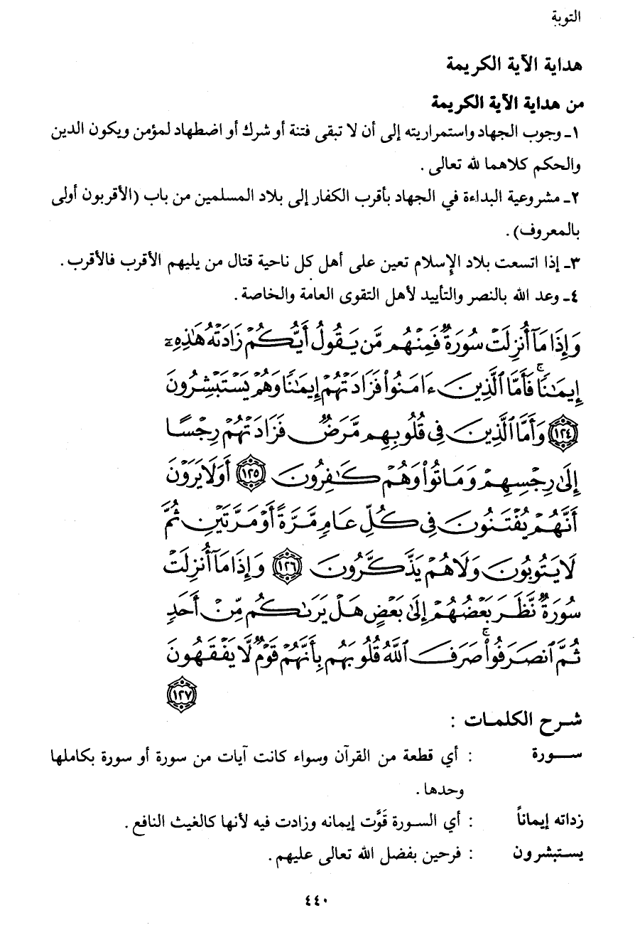 وَإِذَا مَا أُنزِلَتْ سُورَةٌ فَمِنْهُم مَّن يَقُولُ أَيُّكُمْ زَادَتْهُ هَذِهِ إِيمَانًا فَأَمَّا الَّذِينَ آمَنُواْ فَزَادَتْهُمْ إِيمَانًا وَهُمْ يَسْتَبْشِرُونَ (124) وَأَمَّا الَّذِينَ فِي قُلُوبِهِم مَّرَضٌ فَزَادَتْهُمْ رِجْسًا إِلَى رِجْسِهِمْ وَمَاتُواْ وَهُمْ كَافِرُونَ (125) أَوَلاَ يَرَوْنَ أَنَّهُمْ يُفْتَنُونَ فِي كُلِّ عَامٍ مَّرَّةً أَوْ مَرَّتَيْنِ ثُمَّ لاَ يَتُوبُونَ وَلاَ هُمْ يَذَّكَّرُونَ (126) وَإِذَا مَا أُنزِلَتْ سُورَةٌ نَّظَرَ بَعْضُهُمْ إِلَى بَعْضٍ هَلْ يَرَاكُم مِّنْ أَحَدٍ ثُمَّ انصَرَفُواْ صَرَفَ اللهُ قُلُوبَهُم بِأَنَّهُمْ قَوْمٌ لاَّ يَفْقَهُون (127)